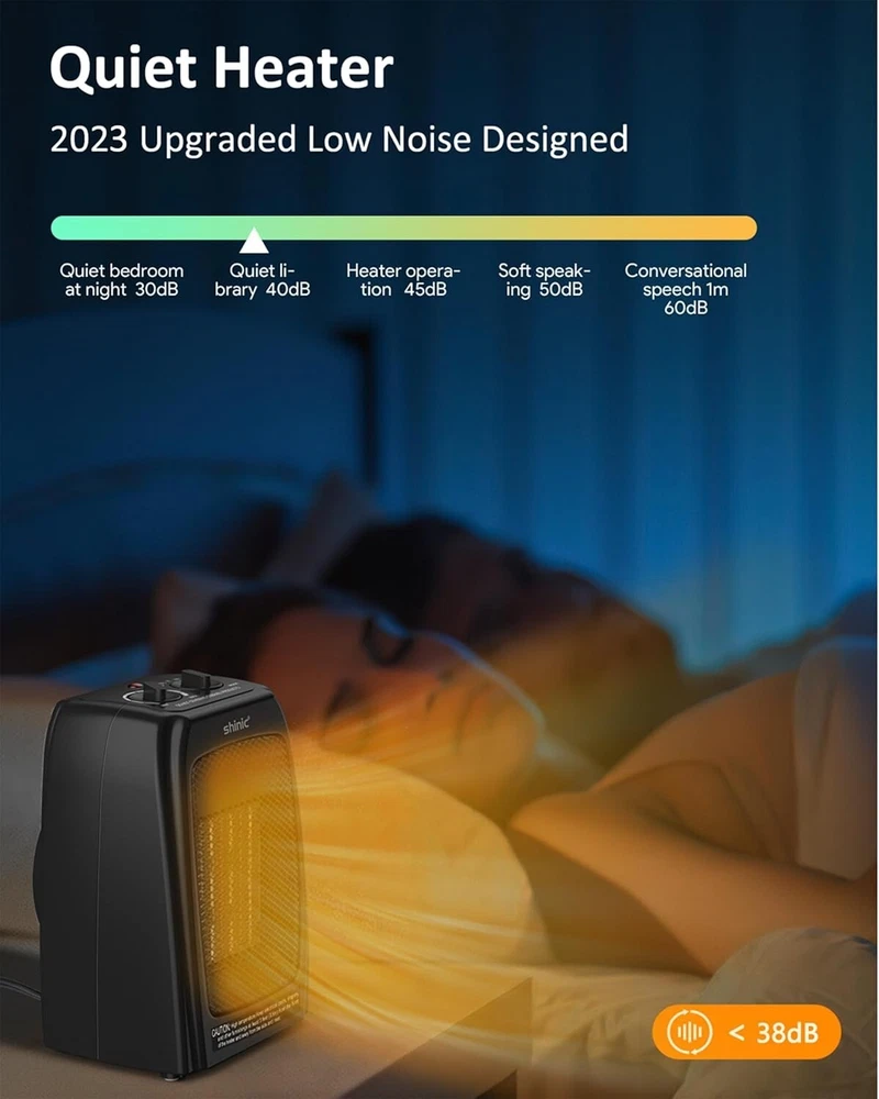 【3 Modes with Thermostat Control】3 Heat Settings; LOW: 900 watts of heat; HIGH: Output heat faster and hotter at 1500 watts; FAN: Blow out cool winds. Electric space heater with thermostat manual control, designed for comfort and warmth, keeping your small room at a set temperature and saving your electricity bills. 【1S Fast Warm-Up】With the PTC ceramic heating technology and high-speed fan, this small space heater can warm you in 1 second! Range up to 200 sq.ft. Saving electricity bills by heating the small space required, instead of using other centralized indoor space heaters. Stay warm and comfortable in your space in the cold once you pick up this energy efficient space heater. 【Multiple Advanced Safety Design】 Overheat and Tip-Over Protection: Aut-off when accident happens, perfect for family with kids and pets; V0 Flame Retardant Material; ETL Listed. The Shinic ceramic space heater, a solid choice for small room,office, living room and bedroom! 【Quiet Space Heater】The operating sound of the office sapce heater is less than 38 dB, quiet enough for most people to use in a bedroom while sleeping, a perfect desk space heater never disturbs you when you sleep or work. 【Space-Saving Desk Space Heater】Dimensions: 6.3 x 5.5 x 9.3 inches; small space heater for office under desk quiet, warm and space-saving. Warm up your body/feet/legs in an instant, but only take a small space. Easy-to-move portable space heaters for indoor use with convenient carry handle and 6 Ft long cord.