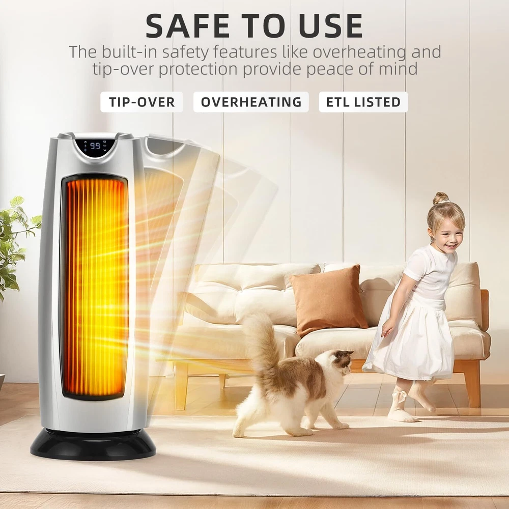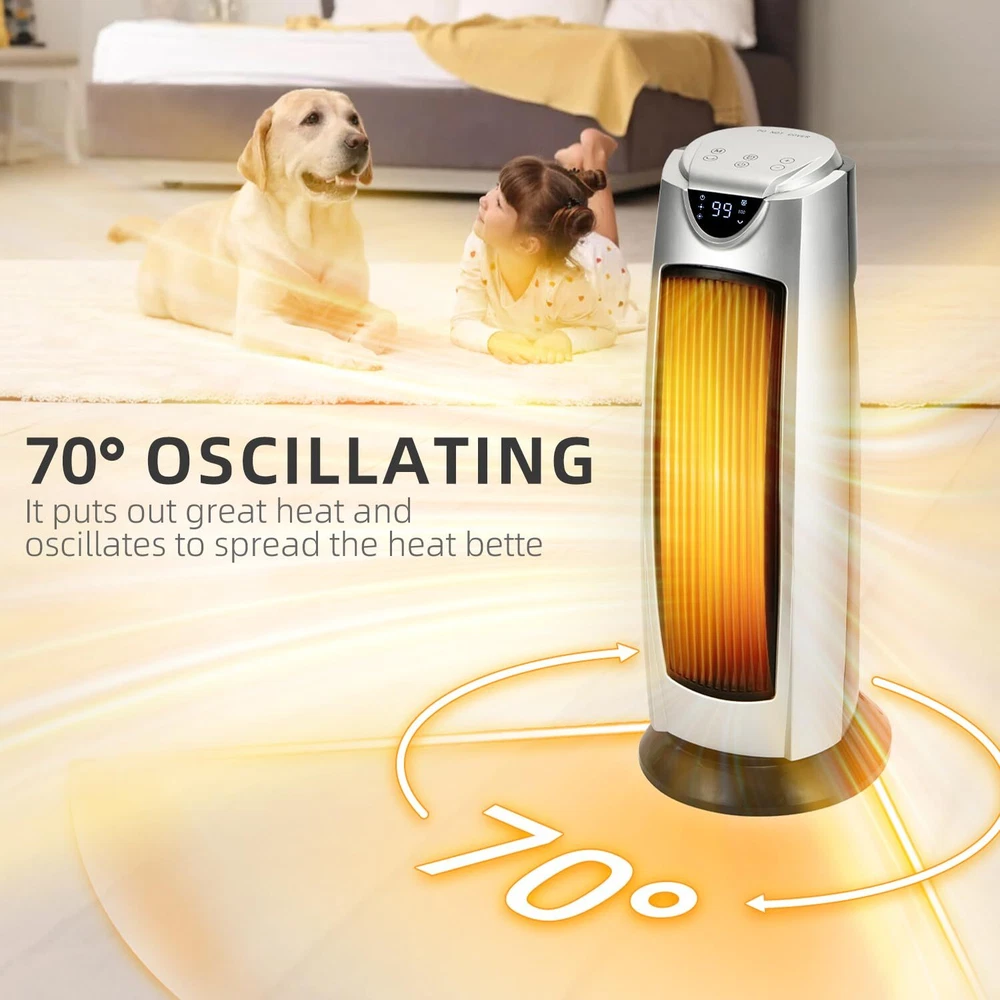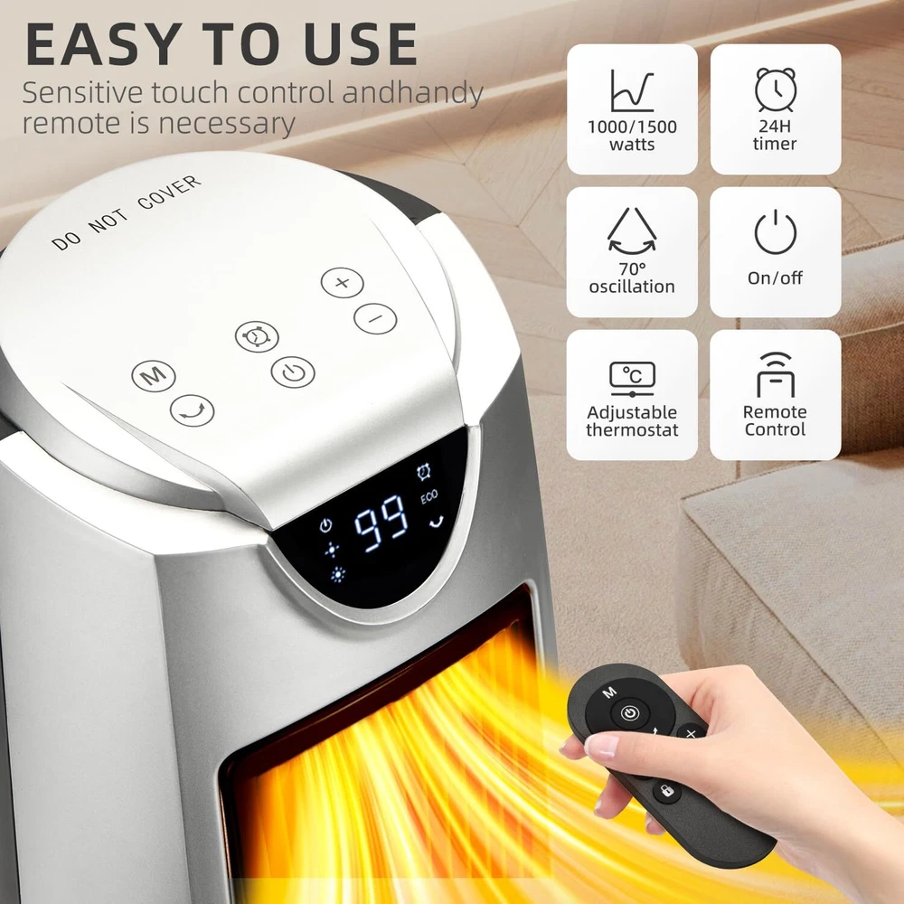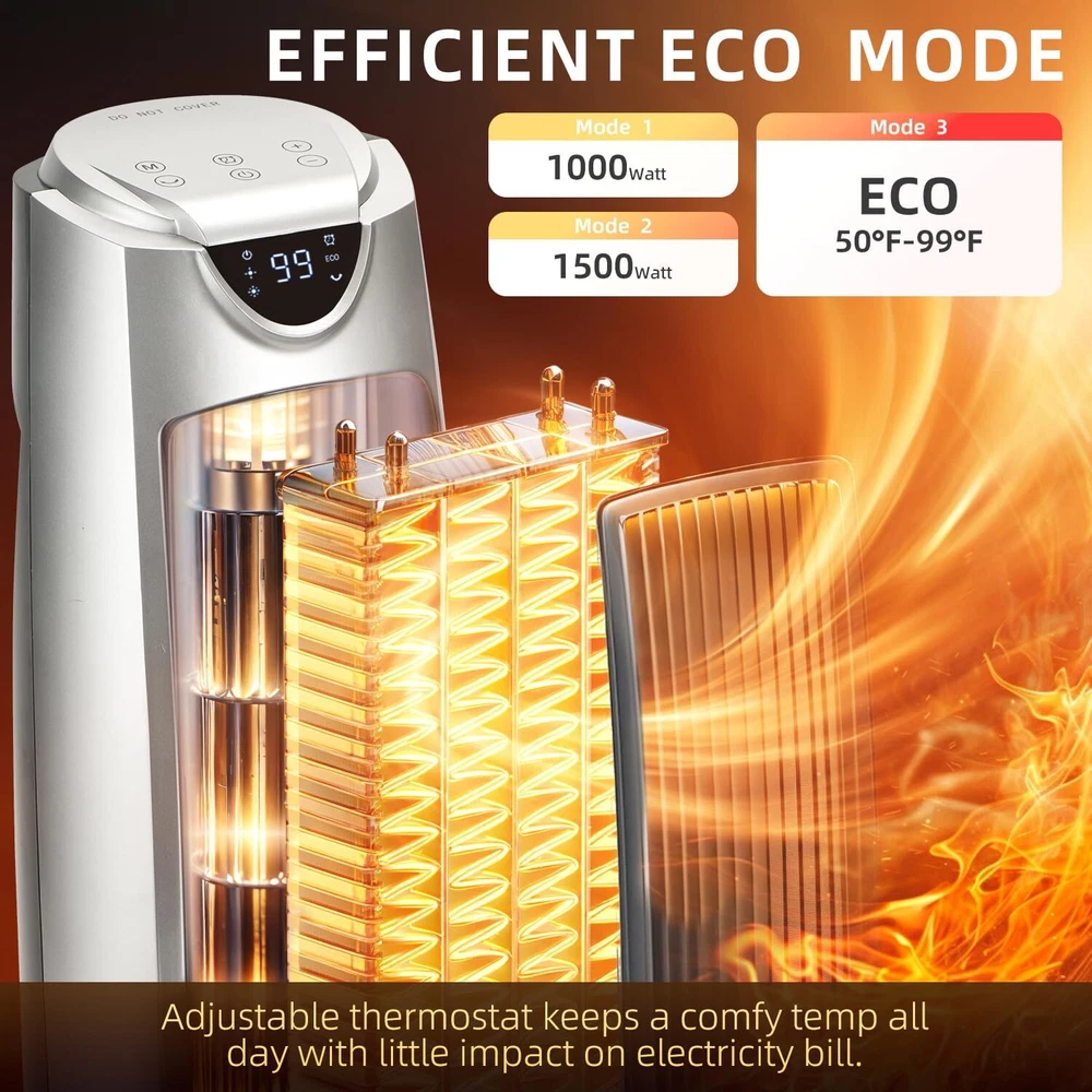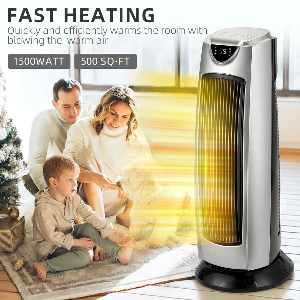 Space Heater 3 HEATING MODES:The heater does a great job of heating up a 500 sq ft room like bedroom or living room with multiple heating levels of 1000watts,1500watts and ECO mode.The ceramic heating element ensures efficient operation and quiet heating.The fan motor blows very strongly,and the heating element heats up in seconds after it is turned on ADJUSTABLE THERMOSTAT:It allows precise control over the desired temp.from 50-99°F,ensuring you can maintain a comfortable temp.throughout the day.It's the high (99°F) heat limit while many others have a lower (from 55-90°F).It allows the temp to rise 4 degrees above the set temp. before shutting off,then kicks back on when it reads 1 degree below set temp. which is a energy saving feature.So you don't have to keep turning it on and off,or worry about heating up a room way too hot BUILT-IN SAFETY:It comes with tip-over protection and a cool-touch exterior,making it safe for homes with children and pets.It also has overheat protection,which prevents the unit from overheating even if accidentally left on for an extended period.Plus the cool touch case makes the heater safe to touch, giving peace of mind for users with children or pets MULTI-FUNCTION REMOTE:It allows for easy adjustments from across the room.Whether you need to turn the heater on/off,set the 24H timer,adjust the thermostat,or control the oscillation feature,everything can be done without needing to get up.This is especially appreciated during cold nights.Moreover,the digital display is intuitive and easy to read,providing real-time information on the current settings,making it easy to set the temperature OSCILLATES TO SPREAD THE HEAT:One of the standout features of the tower heater is its oscillation capability,which ensures even distribution of heat throughout the room.This feature is useful in larger spaces or rooms with multiple seating areas,ensuring everyone feels the warmth without needing to constantly adjust the heater's position