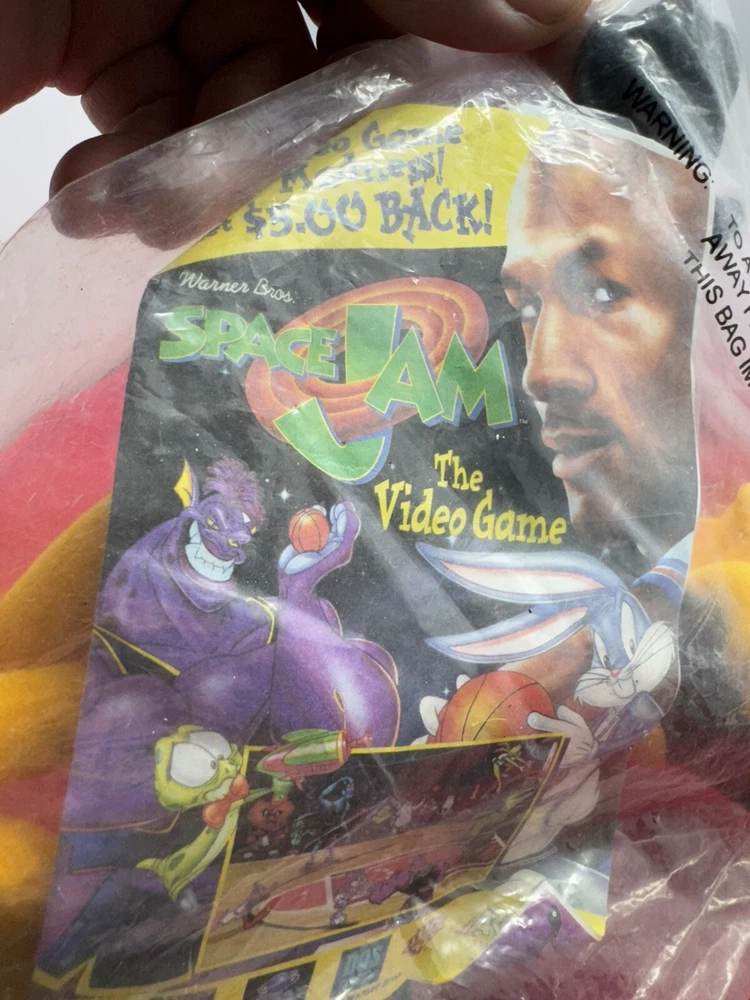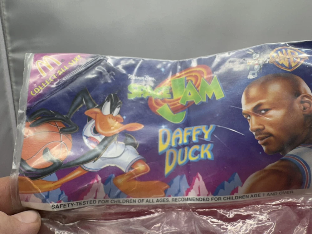The product is a 9" plush stuffed animal of Daffy Duck from the 1996 Space Jam movie, produced by Warner Bros. and McDonald's. The item is sealed and in its original packaging. It features Daffy Duck alongside Michael Jordan. Made in China as part of the Looney Tunes character family. This item is not a custom bundle and has not been modified.