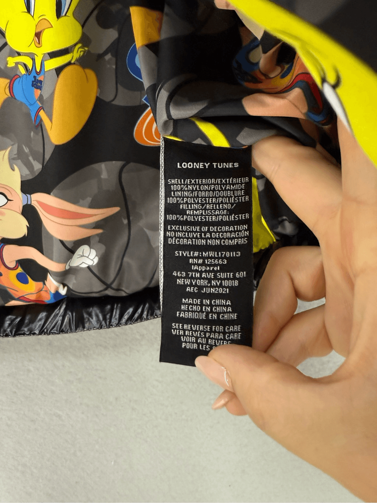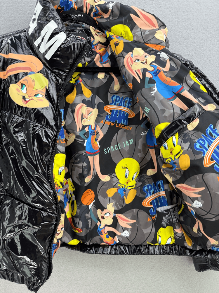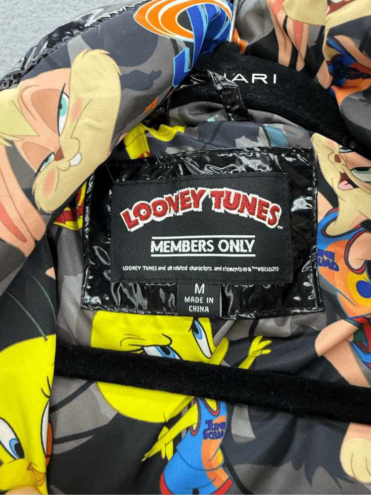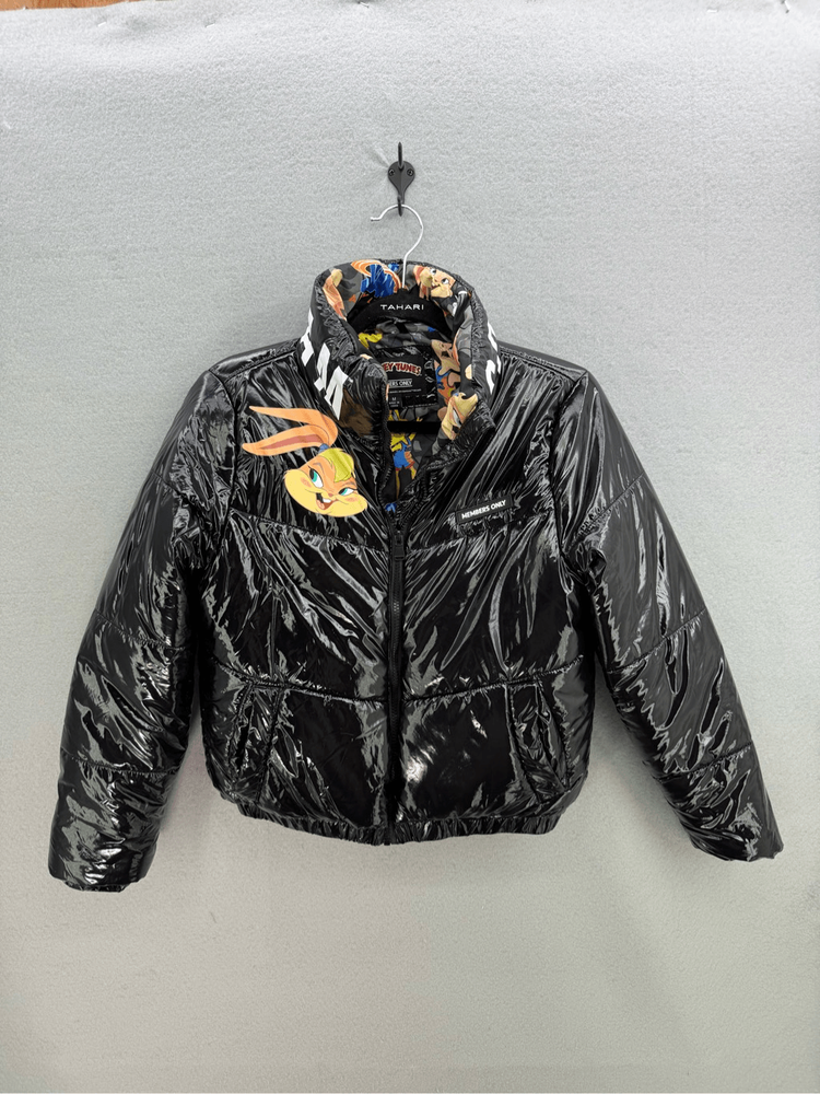 Members Only x Space Jam High Shine Puffer Jacket - Black Size M Ball out in cartoonish style with the Members Only x Space Jam A New Legacy Hi Shine black puffer jacket. This shiny black jacket comes with a mock neck collar and classic puffer construction for serious coziness points, while the mixture of Looney Tunes GUC. No stains or holes. Pet free/smoke free home. Please check all photos for details.