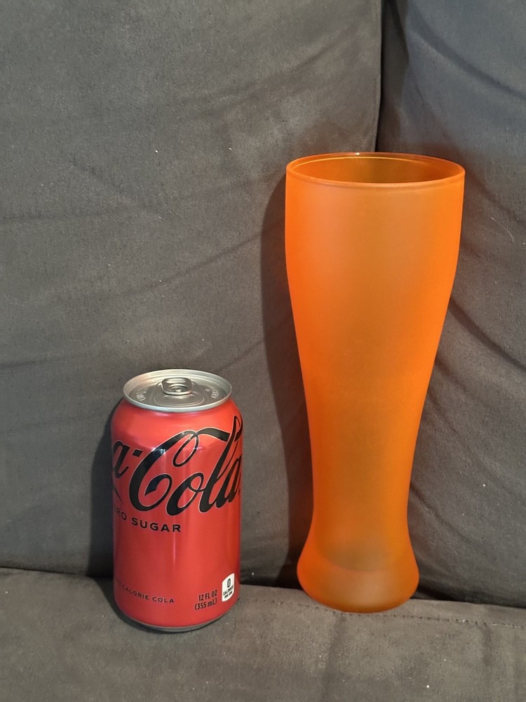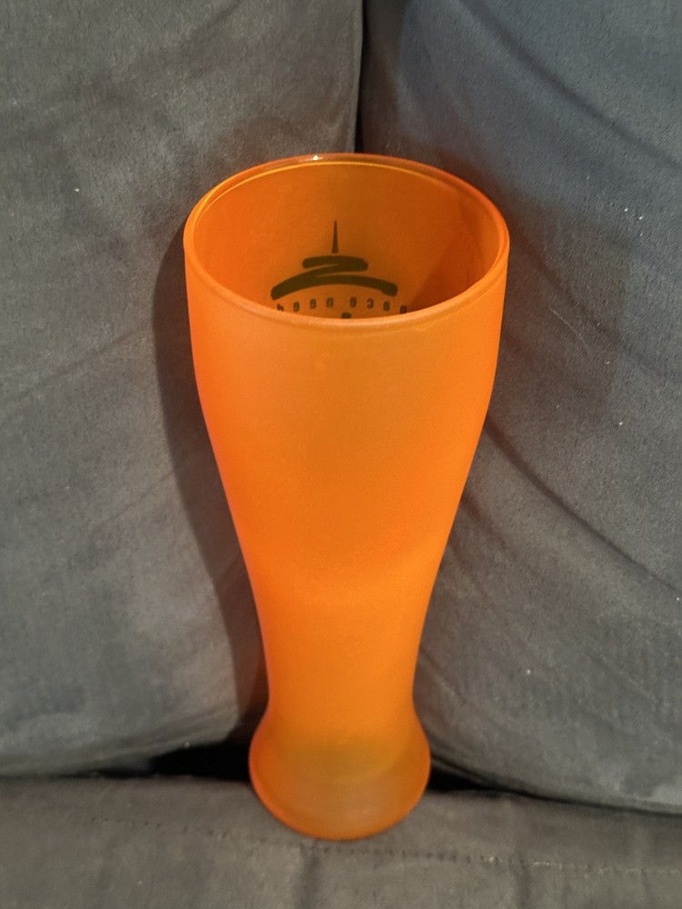 Space needle, neon, orange, tall glass cup made in USA glass 12 oz Great used condition. See all photos.