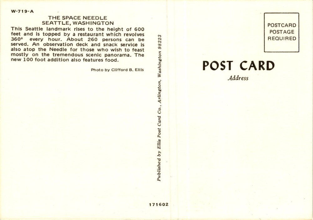 MAKE AN OFFER. THE MORE YOU BUY THE BETTER DEAL I WILL ACCEPT The postcard features an image of the Space Needle in Seattle, Washington. The Space Needle is a famous landmark in Seattle, standing at a height of 600 feet. At the top of the Space Needle is a revolving restaurant that completes a 360° rotation every hour, offering panoramic views of the city. The restaurant can serve around 260 people.
