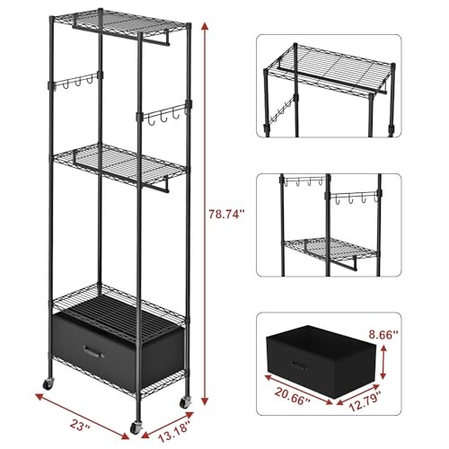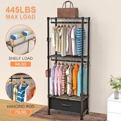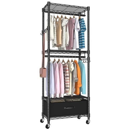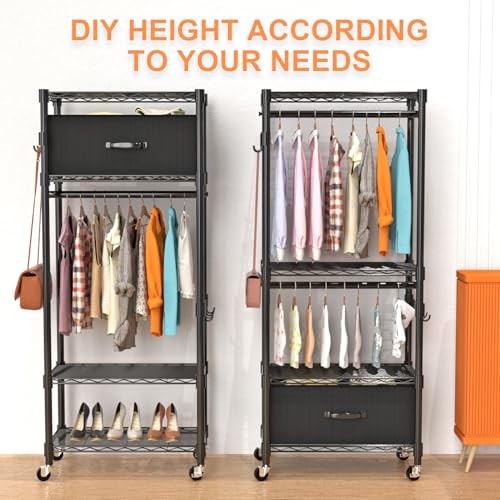 Menu 1. We require immediate payment. 2. We currently accept payment via eBay managed payments only. 3. Once payment is cleared, we will dispatch your shipment within 1-3 business days. Please refer to the "Shipping" tab for more information regarding shipping speed to your destination. Clothes Rack, Clothing Rack for Hanging Clothes, 4 Tiers Adjustable Closet Organizer System with Drawer | Double Rods | Side Hooks | Load 445lbs | 23" L x 13.18" W x 78.74" H | Black Product description HEIGHT ADJUSTABLE: The overall dimensions of the clothes rack are 23" L x 13.18" W x 78.74" H. With customizable assembly options, you can tailor the storage space to your specific needs. It is perfect for hanging suits, coats, long dresses, jackets, pants, and shirts of varying lengths. HEAVY DUTY GARMENT RACK: Constructed with carbon steel materials, our clothes rack ensures utmost durability and a load capacity of up to 445lbs. Painted surface to prevent water and rust, makes it stable and sturdy. EASY TO ASSEMBLE & MOVE: Easy to install, no tools required. Equipped with two locking casters and two free-roll casters, this clothes rack is easy to move around and can be securely locked in place. The addition of foot pads ensures stability and safety. Detachable clothes rack can be easily removed and taken away when you move. VERSATILE USAGE: Whether in your bedroom, cloakroom, laundry room, or closet, our clothes rack is designed to accommodate all you needs. The 8 hooks on the side can be used to hang hats, scarves, and bags. Storage box works well for storing items like wrap, bedding, plush toys and etc. ORGANIZING VERTICAL SPACE: freestanding closet maximizes the vertical space in the room and expands the storage area. Perfect for rental houses, apartments, school dormitories, cloakrooms, bedrooms, laundry rooms and sewing area.Order now-100% satisfied or 180 days return policy. PLEASE MESSAGE US IF YOU HAVE ANY OTHER QUESTIONS, AND MANY THANKS FOR READING ALL OF THIS. Copyright ©#. All Rights Reserved.