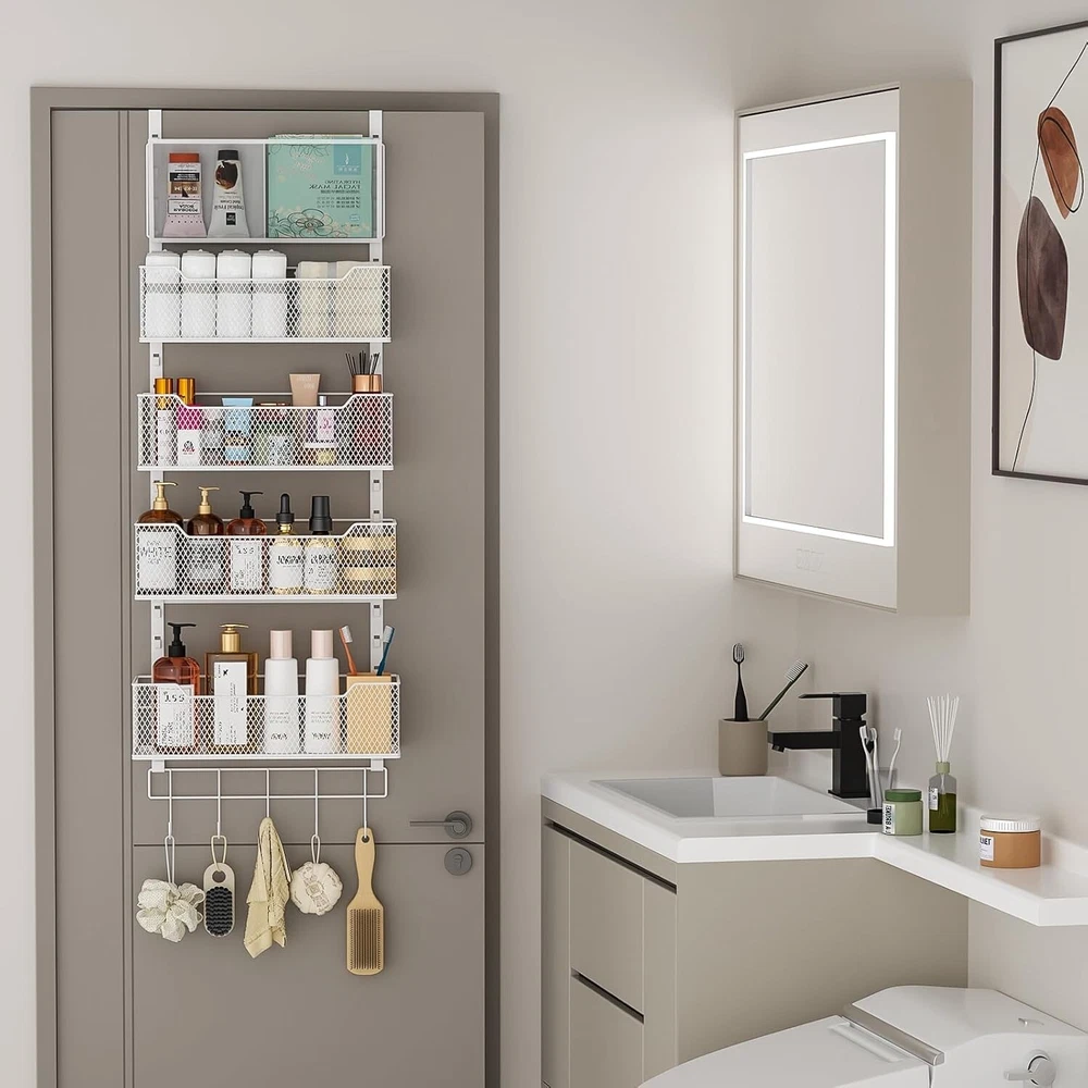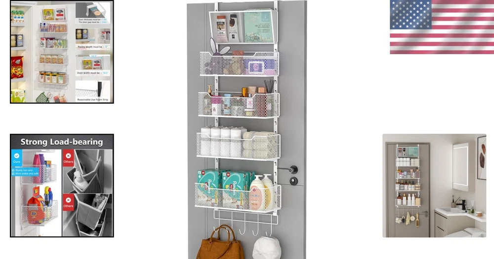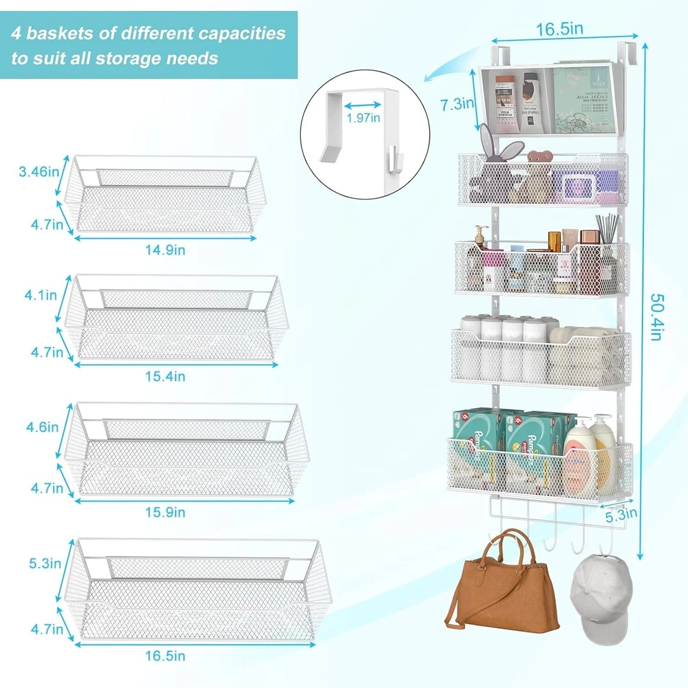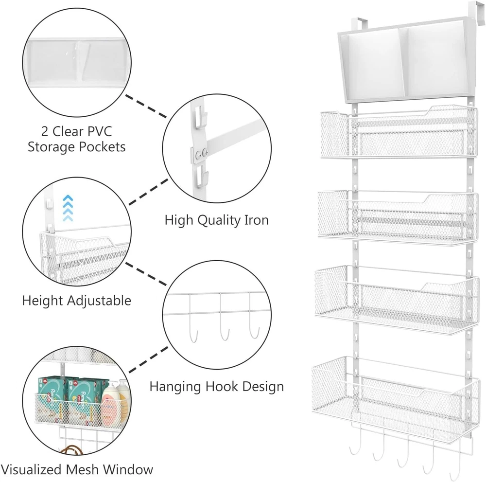 Finish Type: White Style: Contemporary Product Care Instructions: Wipe With Dry Cloth Care Instructions: Wipe with dry cloth gtin13: Does not apply Item Weight: 6.67 lb Number of Compartments: 6 Finish: White Number Of Items: 1 Mounting: Over-the-Door, Wall Mounted Min. Required Door Width: 16.5 Inches Item Depth: 5.3 in UPC: Does not apply Product Dimensions: 5.3"d X 16.5"w X 50.4"h Recommended Uses For Product: Bathroom, Bedroom Special Feature: Heavy Duty, Adjustable Item Width: 16.5 in Material: Metal, PVC, Cotton Installation Type: Door Mount Age Range (description): Baby Item Length: Over The Door Organizer Number of Shelves: 6 Color: White Capacity: 2-5 pairs Number of Items in Set: One-Piece Furniture Finish: White Number in Pack: 1 Included Components: Hook Behind Door, 1 Fabric Bag, 4 Baskets, Hooks Size: 6-tier Room Type: Bathroom Type: Hanging Door Storage Features: Adjustable, Heavy Duty Item Height: 50.4 in Brand: Unbranded