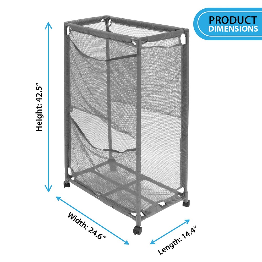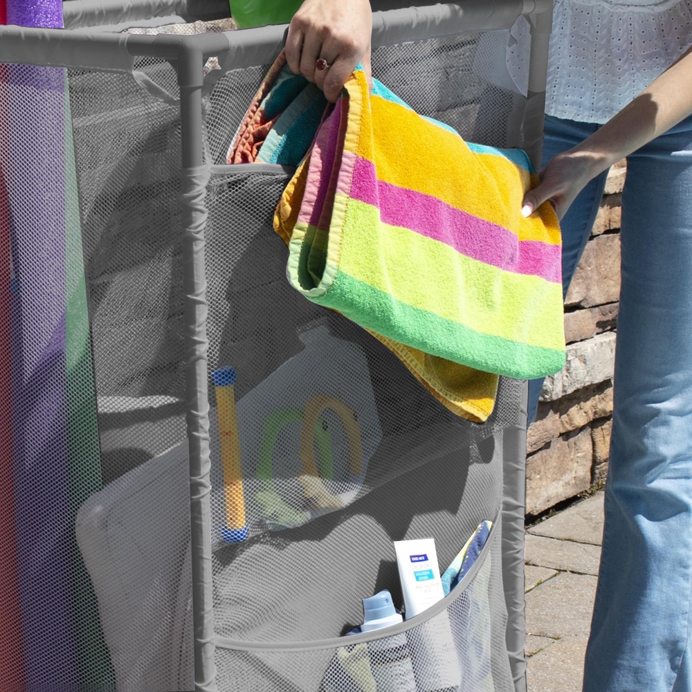 The Pool Accessories Organizer is great for Home use, Swimming Pool Decks, Patio, and on the beach. Use the side pockets to store smaller toys and use the large compartment to store your large floaties and noodles. Made from UV resistant mesh fabric, be worry free from the color fading from the sun's rays. Furthermore, the included wheels make it easy to transport the Organizer with ease. Comes in a vibrant gray color! 14.4" W x 24.6" L x 42.5" H Made of a weather resistant PVC along with a high quality and durable, weather and tear resistant mesh, provide a long-lasting solution for your pool storage needs The slim style is designed for narrow areas. Wheels are lockable on one side to allow for securing the bin in a stationary position or rolling as needed. Side pockets provided for additional storage of small items. Store toys, inflatables, floats, noodles, balls, goggles, pool cleaning tools, and more. Assembled Size: 14.4" W x 24.6" L x 42.5" H Cubic Feet (Mesh Area): 8 Choose from our wide variety of sizes and blue, white, brown or gray color options Tool Free Assembly with our easy-to-follow instructions.