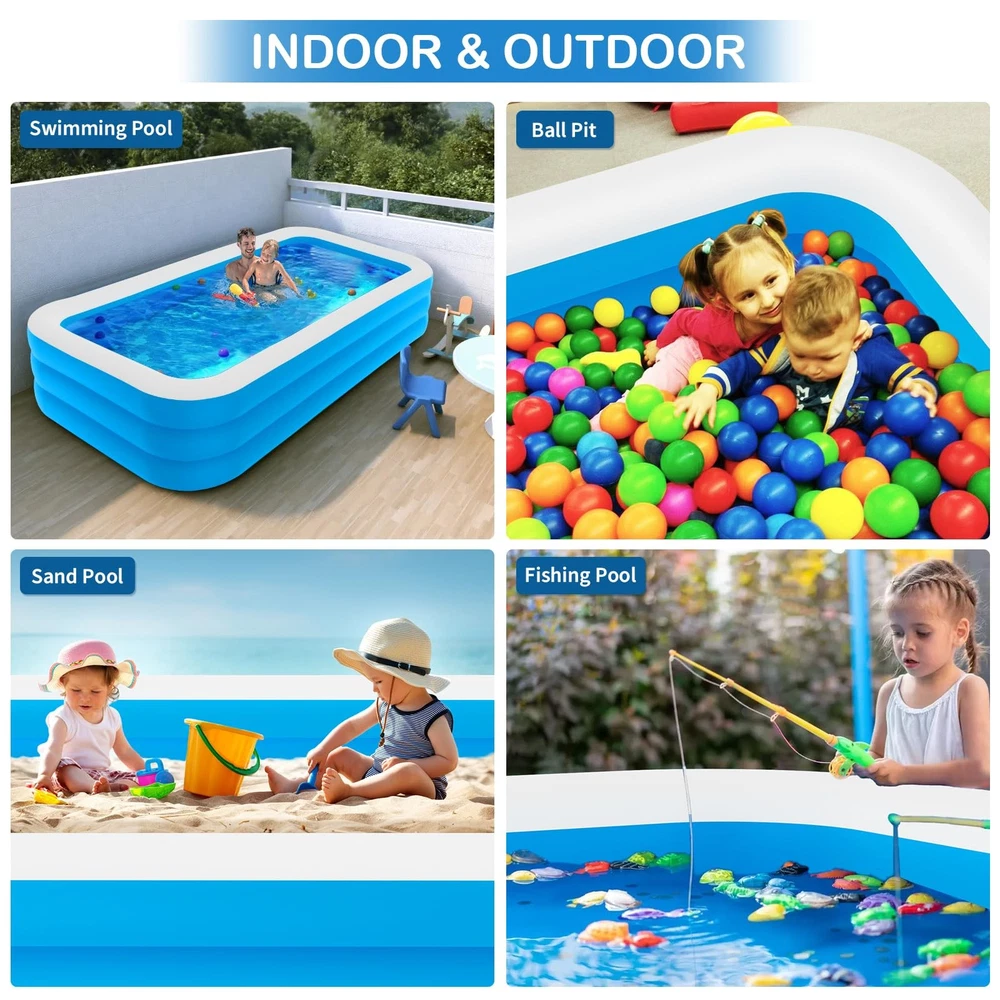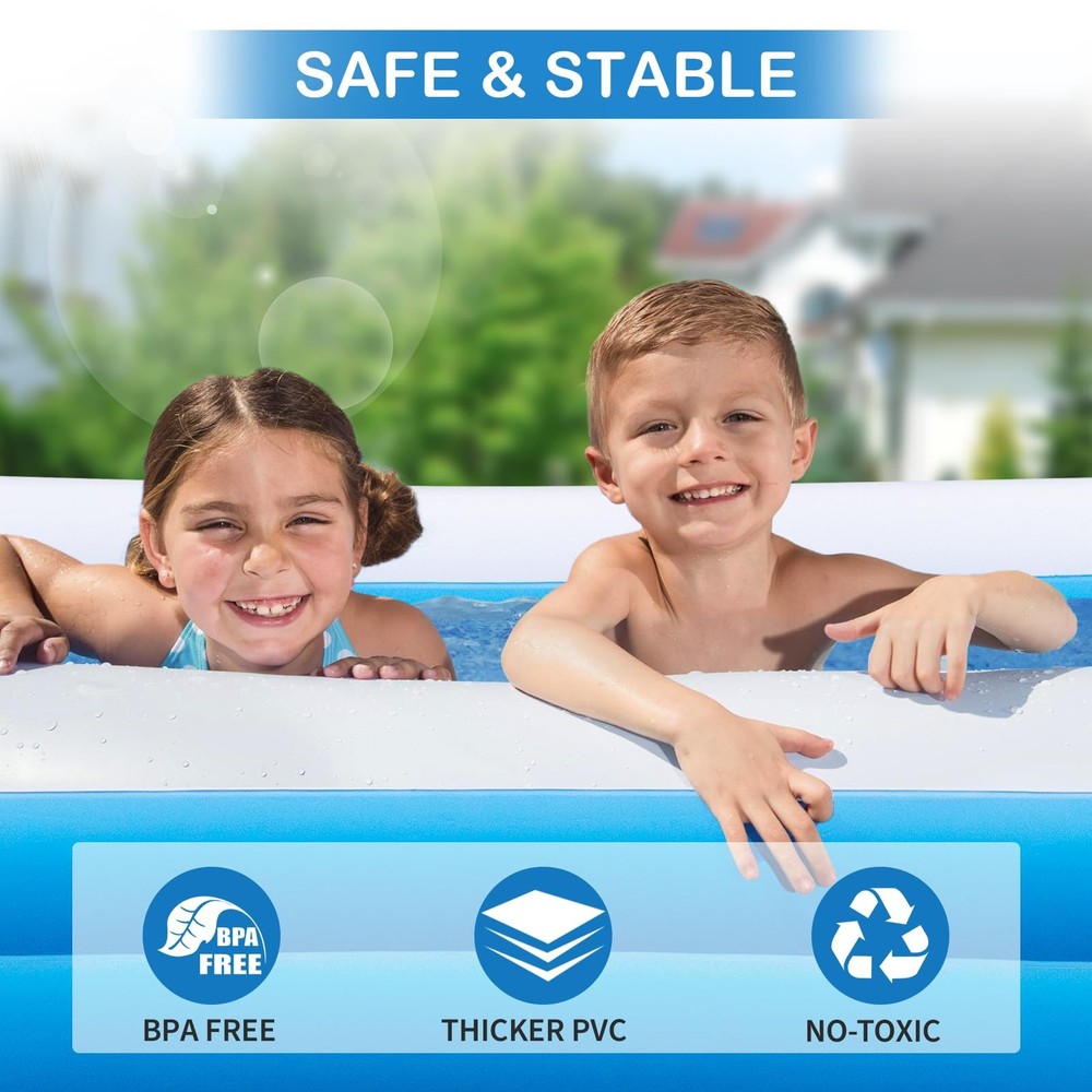 158"*74"*22" Inflatable Swimming Pool with Pump, Larger Family Inflatable Swimming Pool, Safer & Thicker Inflatable Pool Large Inflatable Swimming Pool Large Family Inflatable Pool: 158" X 74" X 22" oversized pool offers 70% Larger space that is enough for a pool party. Easily had 12 people, longer and bigger pool provided more space Safety and Security: The kiddie for kids is made of BPA-free materials, without any toxic chemicals. Meet international standards. It is safe for everyone you love. Thicker PVC 3 times thicker than similar products in the market, makes the blow-up pools for adults more sturdy Easy to Set Up: Large inflatable pool with pump can be inflated within 3 minutes. Each chamber has dual air valves to prevent air leakage. Tips: open dual air valves to inflate/deflate faster Durable and Sturdy: The family pool is made of thickened PVC material, thick durable, and fadeless, it is thicker and more resistant to punctures than other pools. Every package includes 3 pieces of repair patches just in case 3 Individual Air Chambers: The kiddie pool is designed with 3 air chambers for faster inflation and deflation, more stable and do not collapse easily. You can choose the height according to your needs Great Gift: The inflatable swimming pool is a great gift for your friends, kids, and pets. Not only can be a swimming pool but also can be a ball pit, bathtub, or fishing pool. Enjoy a happy time with pool, not only in summer
