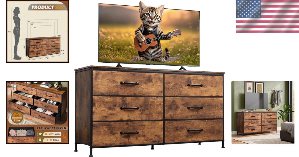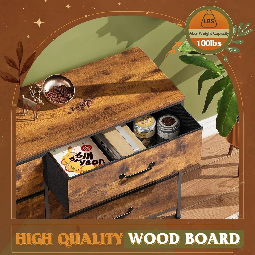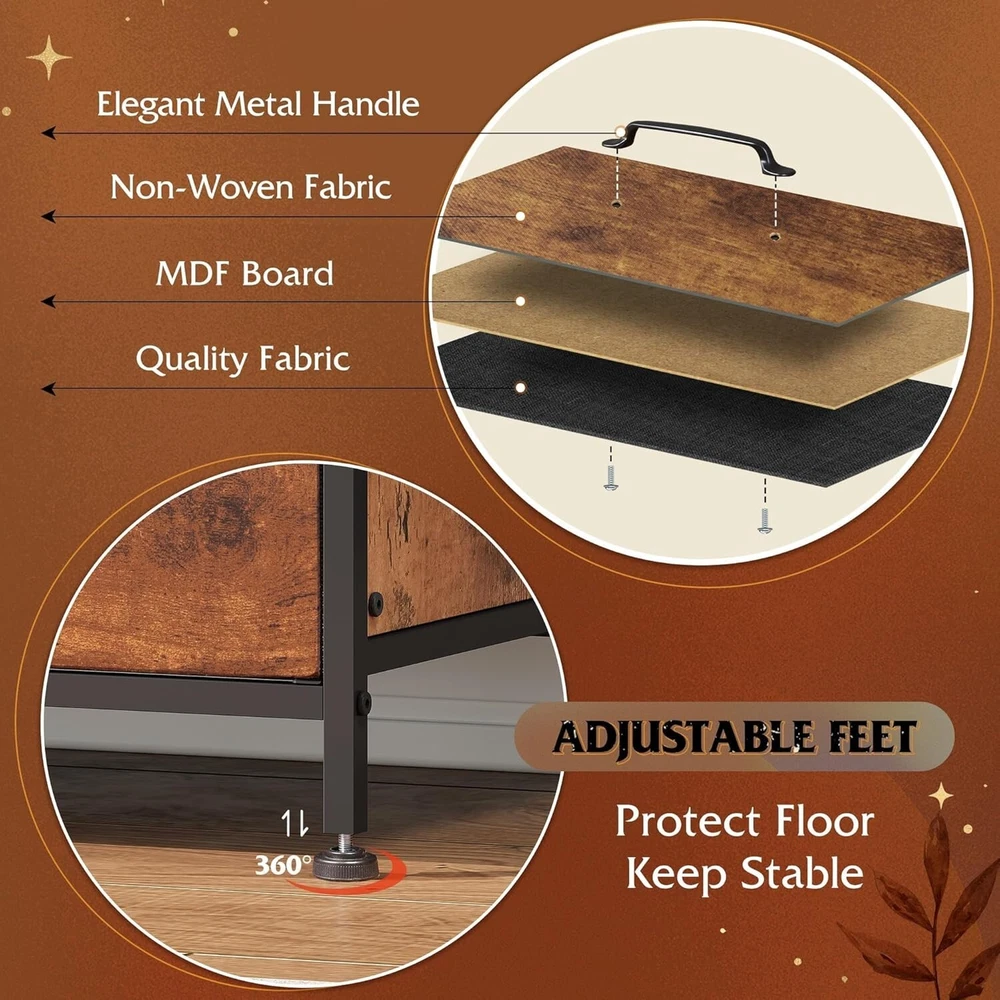 Department: Adults, Teens, Kids, Unisex Baby & Toddler Maximum Weight Capacity: 100 lb Room Type: Living Room Furniture Finish: Brown Item Width: Fabric Dresser Type: Dresser Number Of Pieces: 1 Era: 21st Century (2000-now) Material: Fabric, Steel, Wood Additional Parts Required: No Shape: Rectangular Number of Drawers: 6 Care Instructions: Clean with Dry Cloth Product Care Instructions: Wipe With Dry Cloth gtin13: Does not apply Special Feature: Adjustable Feet Size: 15.35"d X 51.18"w X 27.24"h Personalized: No Room: Living Room, Bedroom, Entryway, Closet, Hallway, Dorm Distance from Floor to Bottom: 4 in Item Length: Fabric Dresser UPC: Does not apply Handle Material: None Handle Finish: None Finish: Brown Features: Adjustable Feet Style: Contemporary/Modern Mounting: Free Standing Handle Type: None Color: Rustic Brown Brand: Unbranded Wood Tone: Medium Wood Item Depth: 15.4 in Product Dimensions: 15.35"d X 51.18"w X 27.24"h Item Height: Fabric Dresser Mounting Type: Floor Mount Item Weight: 40.8 lb Required Tools: No Tools Required Door Mechanism: None