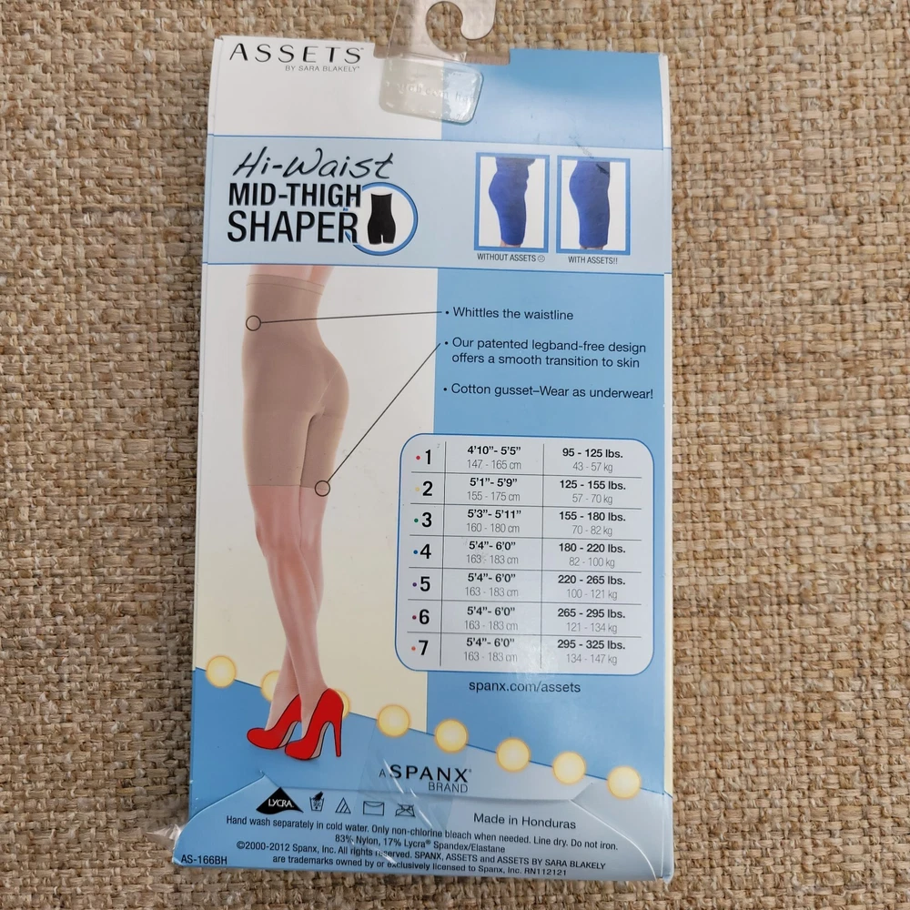 Spanx Assets Hi Waist Mid Thigh Shaper Size 3 Nude 166B 5'3" - 5'11"/155-180 lbs *Eliminates muffin top *Firms thighs and rear *Streamlines silhouette in dresses *Total waist control *Smooth transition to skin *Cotton gusset - wear as underwear Size 3: 5'3" - 5'11"/ 155-180 lbs.
