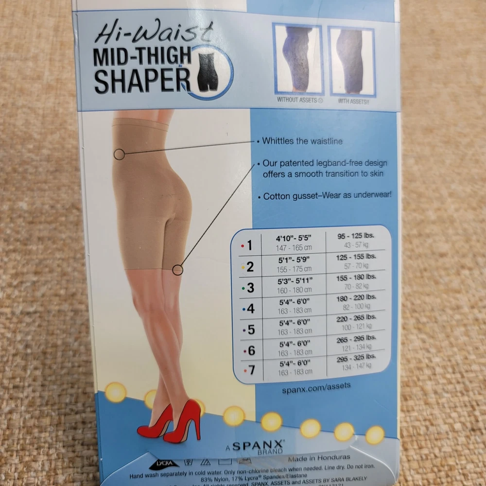 Spanx Assets Hi Waist Mid Thigh Shaper Size 4 Nude 166B 5'4" - 6'0"/180-220 lbs *Eliminates muffin top *Firms thighs and rear *Streamlines silhouette in dresses *Total waist control *Smooth transition to skin *Cotton gusset - wear as underwear Size 4: 5'4" - 6'0" / 180 - 220 lbs