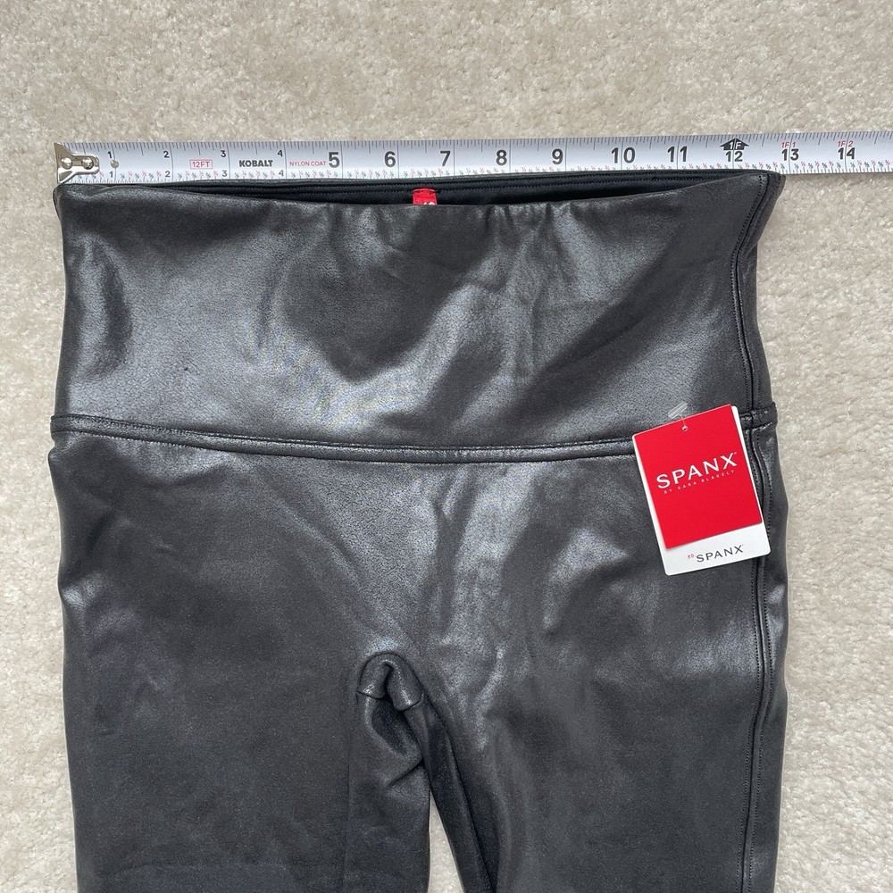 Elevate your wardrobe with these Spanx faux leather black leggings, perfect for any stylish woman. These leggings come in a size medium and are brand new with tags. The blended fabric provides a comfortable stretch while shaping your figure. These leggings have it all - a sleek black color, a flattering style, and are even machine washable for easy care. Whether you're dressing up for a night out or running errands during the day, these Spanx leggings are a versatile addition to any outfit. *small blemish on right side waistband-see photo Please review photos for details, measurements and condition