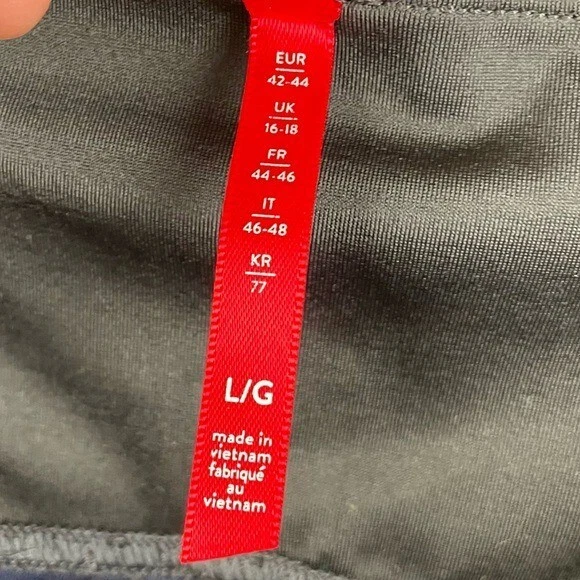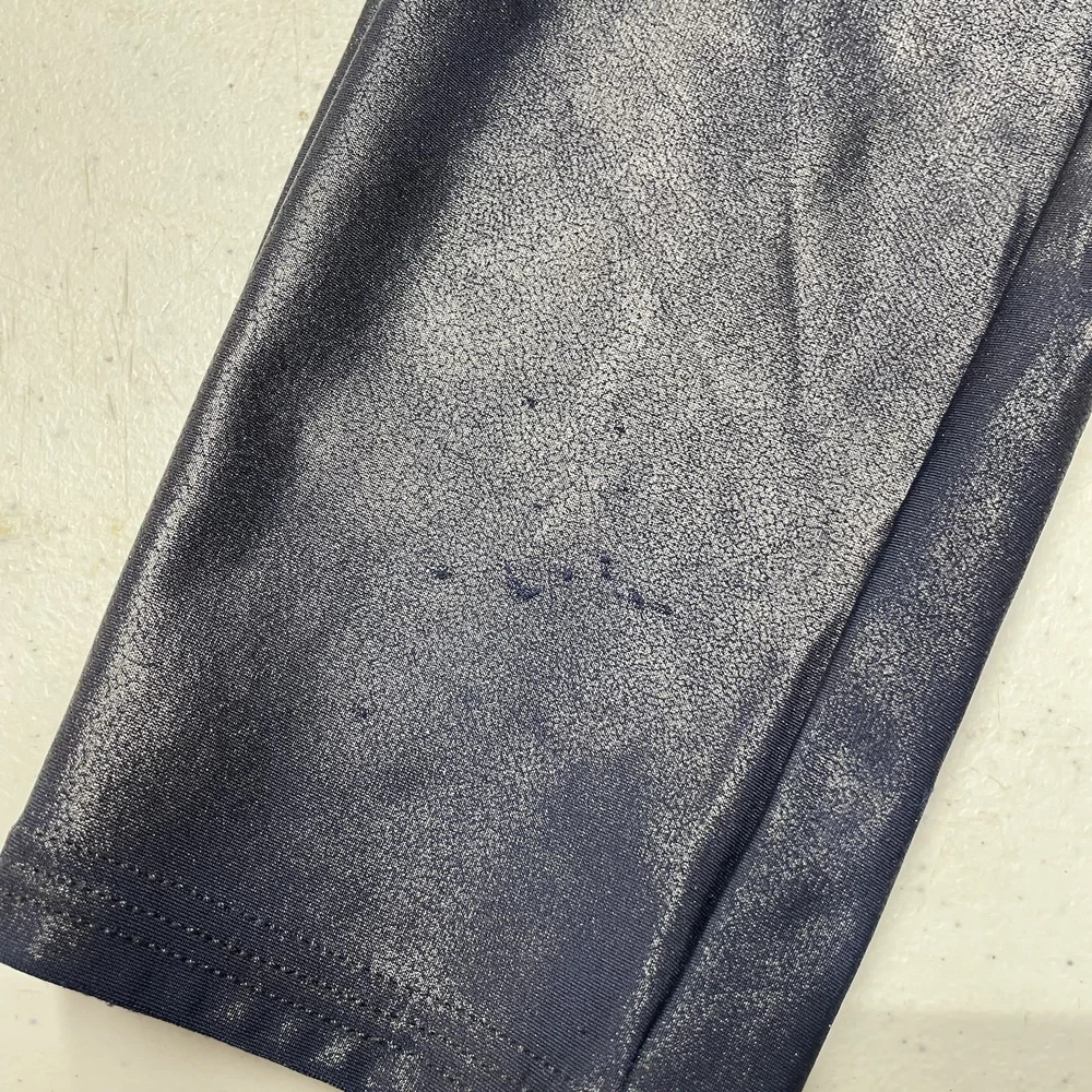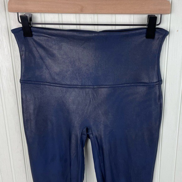 Spanx Faux Leather Leggings in Deep Navy Blue/Black Style 2437 Wide waistband, high rise, with metallic shine. Size Large Great pre-owned condition Some minor wear/pilling on leg area - see last photo Approximate measurements: Waist: 14” across Rise: 9” Inseam: 28”