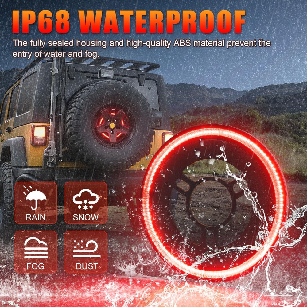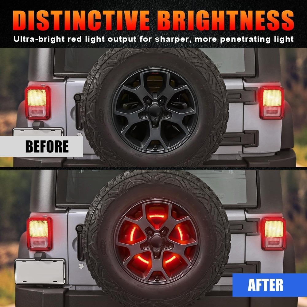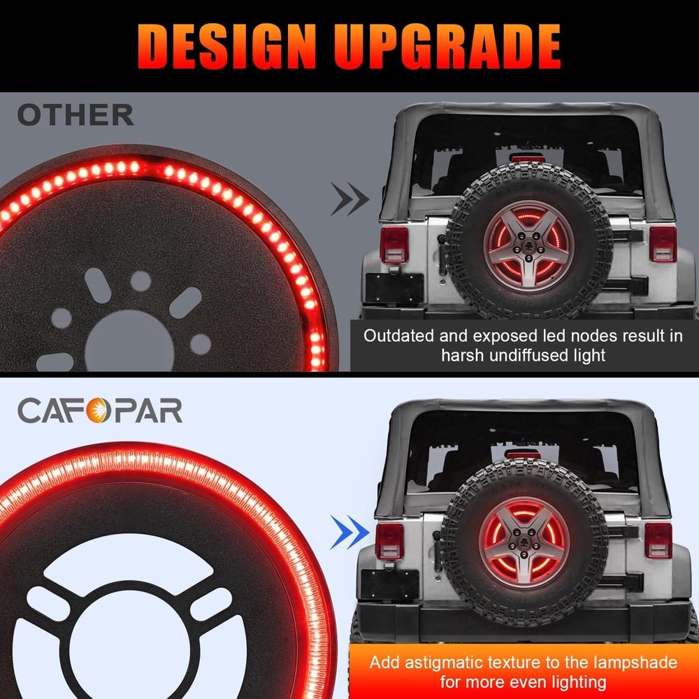 Spare Tire Brake Light Fit for Jeep Wrangler 2007-2017 JK JKU YJ TJ, Tail Light Rear LED Ring Wheel Light Plug and Play Red Lens About this item DESIGN UPGRADE: The CAFOPAR spare tire brake light features an advanced polypropylene mounting plate and a highlight lens with an astigmatic texture, delivering a clear, bright, and instant brake warning signal. Its plug-and-play design allows for quick and easy installation, taking only about five minutes to complete IP68 WATERPROOF: CAFOPAR LED spare tire brake lights are crafted from high-quality automotive-grade ABS material and a PC lens. The fully sealed housing design prevents moisture from entering, ensuring the brake light performs reliably in various extreme weather conditions, including rain, fog, and snow EASY INSTALLATIOIN: The third brake light is easy to install with a plug-and-play design—no drilling or wire cutting required. Simply remove the spare tire, mount the brake light onto the stud, and connect one plug to the factory car harness and the other to the factory third brake light. Ensure the connectors are fully engaged and locked in place, then reattach the spare tire. The installation is now complete COMPATIBILITY: The 3rd brake lights fit for jeep Wrangler 2007-2017 JK JKU YJ TJ. The brake warning light will promptly and clearly illuminate the inside of the spare tire, effectively reducing the risk of rear-end accidents and enhancing your driving safety