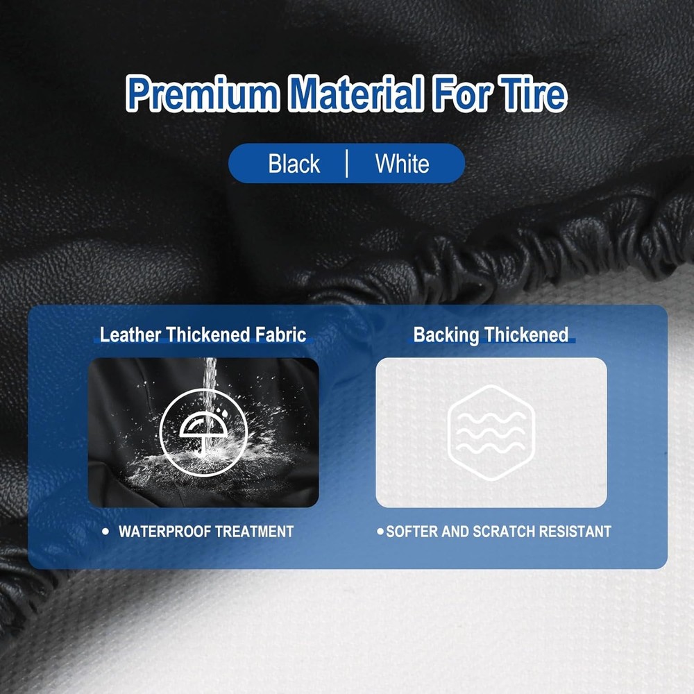 About this item Thickened spare tire covers for trailers are made from high-quality PVC leather, which is 2-3 times thicker than standard options, and the stitching is neat and tight. No matter how it is used, it will not break or crack. All-Weather Toughness: The surface of the tire covers features a seamless polyurethane (PU) coating that creates a watertight barrier, preventing rain and moisture from reaching your spare tire. It effectively blocks harsh UV rays to prevent cracking, fading, and premature aging, extending your tire's lifespan. Easy to install, the spare tire cover is designed with an elastic band that is tough and not easy to break. The cover fits securely on a tire and is effortless to install, making it a hassle-free addition to your RV, Jeep, SUV, or camper. It can be easily installed and removed by hand without additional tools. Wide application, the tire cover features a classic design. It adds a personalized touch to your vehicle while offering durability and protection for your spare tire. It is suitable for most car models such as RVs, trucks, SUVs, Wranglers, trailers, etc. Spare tire covers come in a variety of Package Dimensionss to fit different car models to meet your needs. Please measure the Package Dimensions of your tires before you buy; for details, please refer to the Package Dimensions chart provided. Package Dimensions: 9.41 x 7.01 x 3.15 inches.