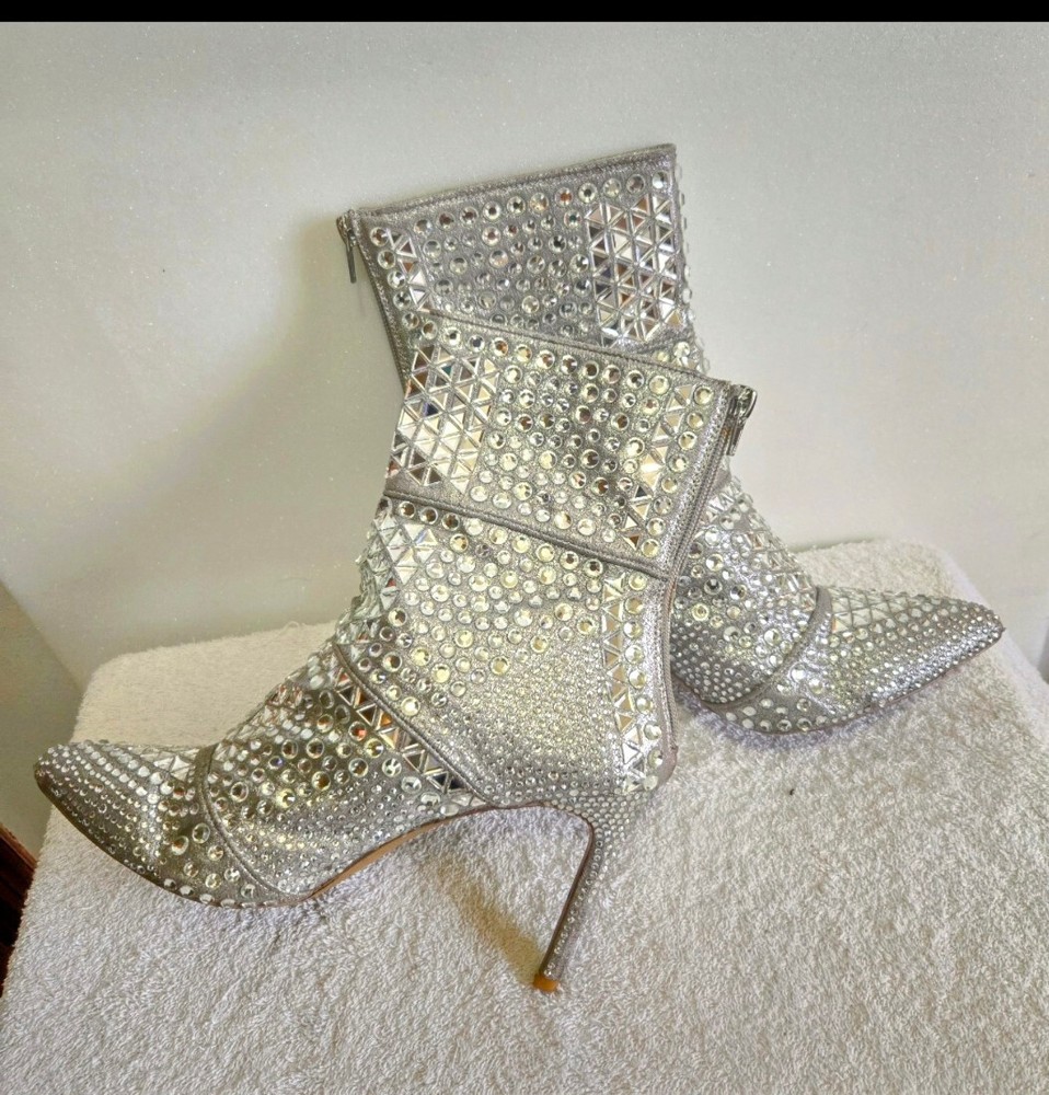 Boss-Up your shoe game with these Steve Madden Rhinestone Booties, a chic addition to any wardrobe. These mid-calf booties feature a striking silver leather upper, complemented by eye-catching rhinestone accents that are sure to add a touch of glamour to any outfit.Crafted for comfort and style, these booties come in a US size 10 and boast a supple leather lining, ensuring a luxurious fit. Whether you're dressing up for a night out or adding a sophisticated flair to your day wear, these Steve Madden booties are a versatile choice that doesn't compromise on elegance.