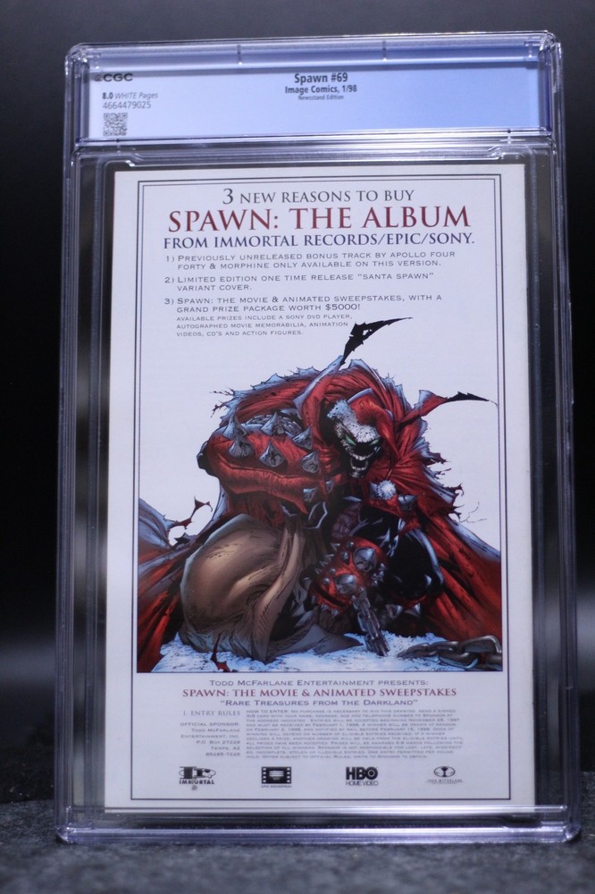 Link to our BEST items!! Link to our ENDING items!! Link to our FAQ page !! Link to our NEWEST items!! Item: Spawn (1992) #69 Newsstand CGC 8.0 White Pages Greg Capullo & Todd McFarlane Special Notes: This issue is a First Printing! We do not use stock photos! What you see in the pictures is what you will be getting. Publication Date: Jan 1998 (The date in the title refers to the year the title started) Writer: Todd McFarlane Interior Artist: Todd McFarlane Cover Artist: Greg Capullo Condition: CGC 8.0 Very Fine Page Quality: White Pages Bar Code: 4664479025 SHIPPING: All pricing is based on the weight of the package and your location. Package Weight: 3 lb[s] Package Size: 14x12x6 We charge exact shipping costs per USPS with NO handling charge. You can check our shipping quotes on the USPS website. For the convenience of the winner, we offer shipment via Priority Mail or Media Mail, when shipping to an address inside the USA. For International Winners, we offer Priority Mail International or First-Class International Mail. Please click on the "SHIPMENTS and PAYMENTS" tab above for more details. * FREE Insurance, for items totaling under $100.00, is only available when shipping with USPS Priority to an address within in the USA! All packages will have a tracking number sent to the winner! Shipping & Payment Terms: If you would like to have your item insured, please contact us and we will send you an invoice with the adjusted shipping charges. We will be happy to combine the shipping charge for multiple auction wins . If you win a single item, you do not have to wait for an invoice to make your payment. IF YOU WIN MULTIPLE AUCTIONS, PLEASE WAIT UNTIL WE SEND YOU A COMBINED INVOICE BEFORE PAYING FOR YOUR ITEMS. Please DO NOT pay for items separately. We will ship your items within 2 business days upon receiving your payment. Payment Options: PayPal is the preferred method of payment per eBay's policies. If you do not have a PayPal account, we do accept credit card payments over the phone. Payment MUST be received within 7 business days of the auction ending or your bid will be cancelled and eBay will be contacted. Questions: We will be happy to answer any questions you have about our items before the auction ends. Please ask your questions as early as possible so we have plenty of time to answer them. Return Policy: All returns MUST be approved by Duncanville Bookstore. If there is a problem with your order, please give us a chance to address the issue before you leave negative feedback and/or contact PayPal for a refund. Store Info: Please check our other auctions and our eBay store for more great deals!! Check out our info page for more great ways to get in touch with us. Also, feel free to contact us if you are looking for anything in particular or you are looking to sell your items. We are always buying!! Duncanville Bookstore is open 7 Days a Week 10am-7pm CST!!