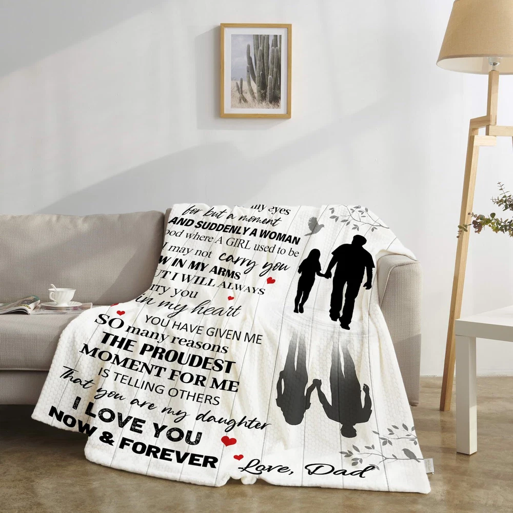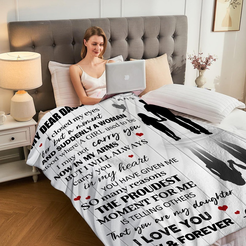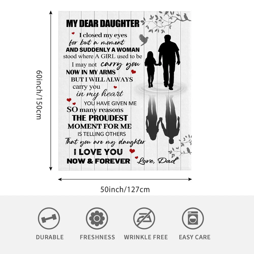 Sweet Daughter Gift: Our cozy and warm blanket is the perfect gift for your daughter's birthday or any special occasion. Made from anti-pilling flannel, it provides comfort and love that she'll cherish forever Gifts for Daughter From Dad: With meaningful words printed on the blanket, this gift is a beautiful reminder of the bond between father and daughter. It's a thoughtful way to show your love and appreciation, bring a smile to your daughter From Dad to Daughter Gifts: This Daughter Blanket is specifically designed as a gift from a father to his daughter. It's a heartfelt gesture that will make her feel loved and special Daughter Gifts from Dad: Our Blanket is both soft and durable. It's anti-pilling flannel fabric ensures it will remain cozy and retain its warmth throughout the years. Whether it's for travel, camping or home decor, it's designed to fulfill your daughter's needs Perfect Gift Idea: Our Blanket is not just for birthdays - it's a versatile gift that can be given on any occasion. Whether it's a daughter's graduation, wedding, or simply a gift to show your love, this blanket is sure to be appreciated