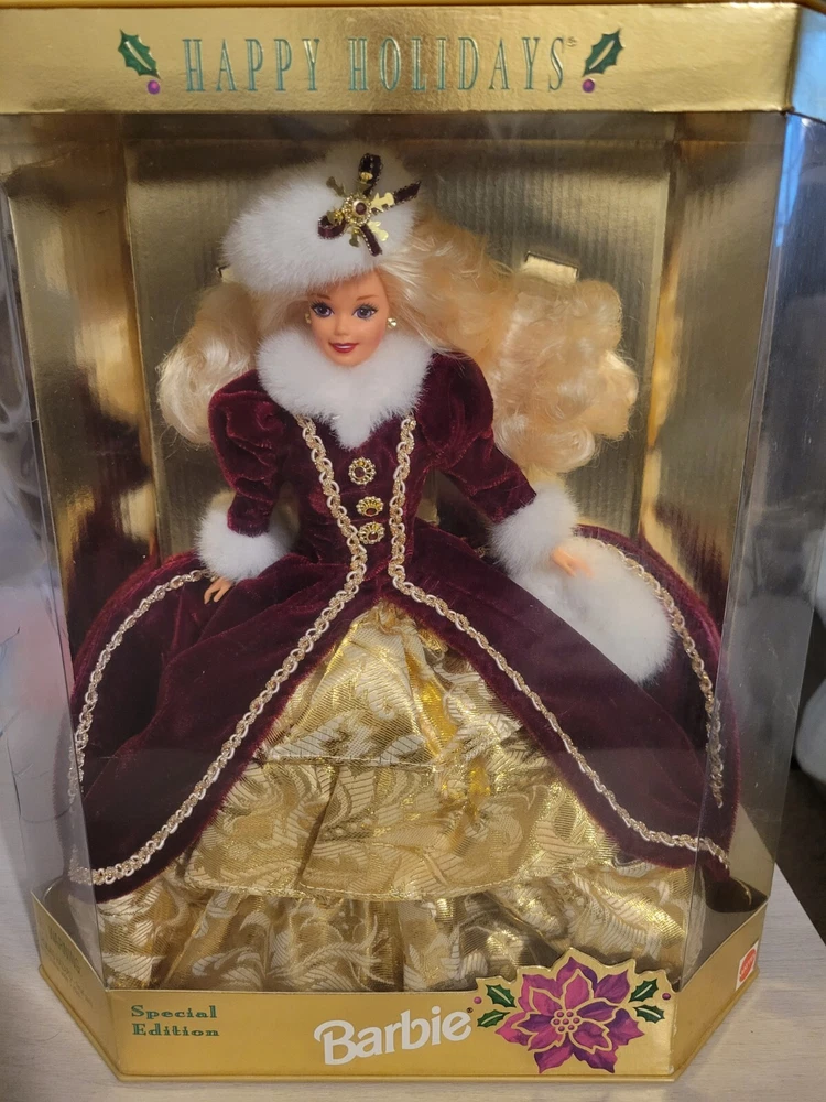 This is a special edition 1996 Happy Holidays Barbie fashion doll produced by Mattel. The doll is part of the Happy Holidays Barbie product line and features Barbie as the character. The doll was manufactured in 1996 and is considered a collectible item.