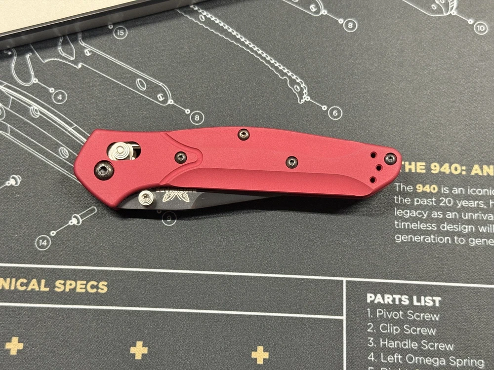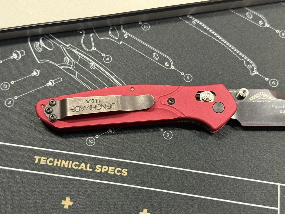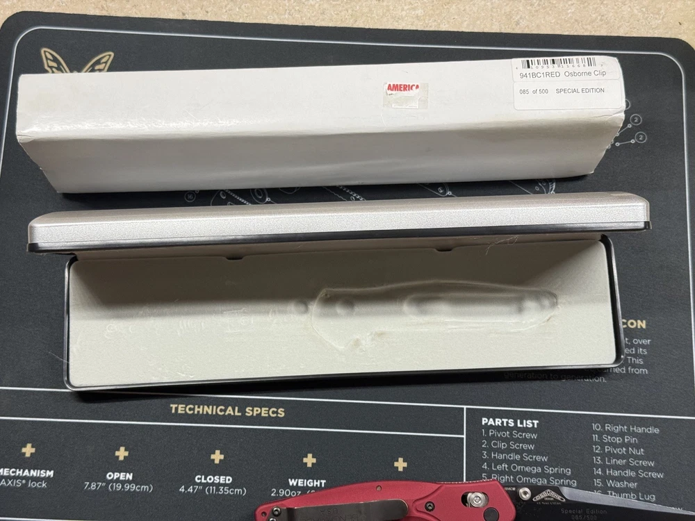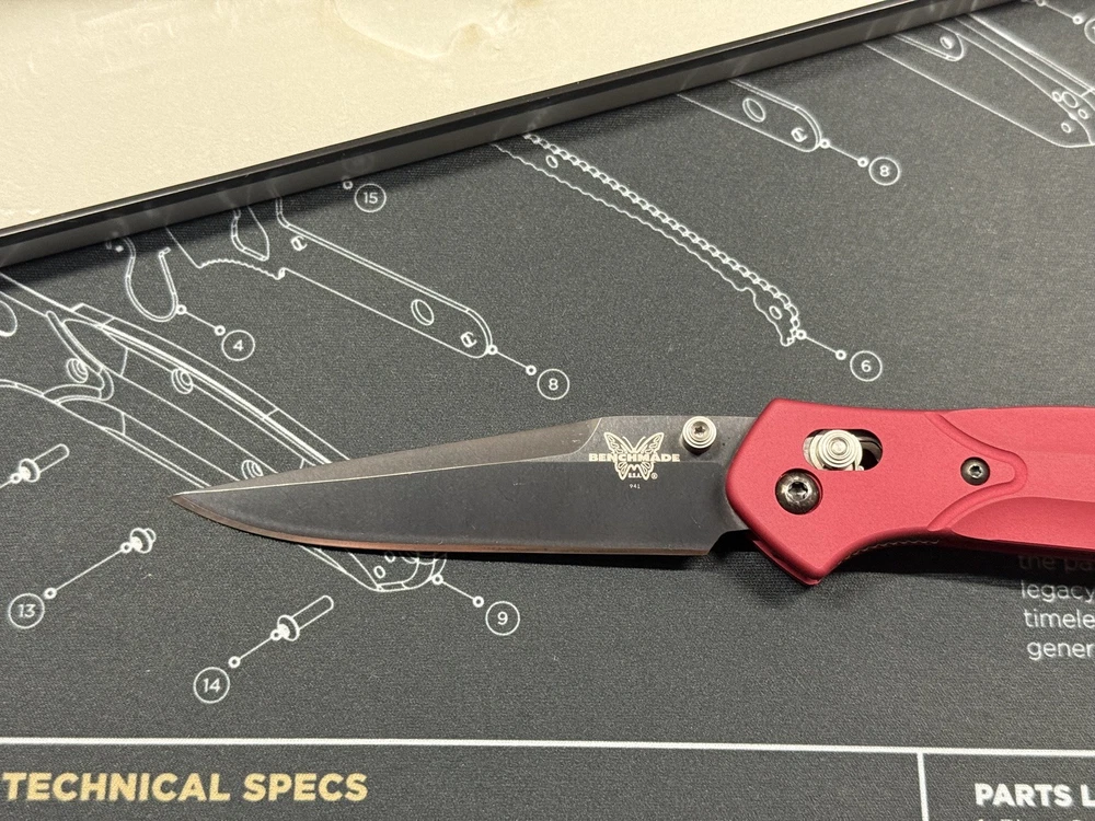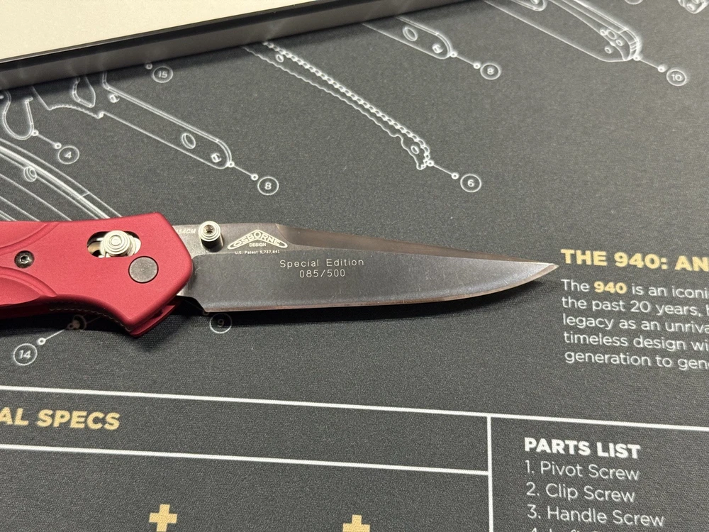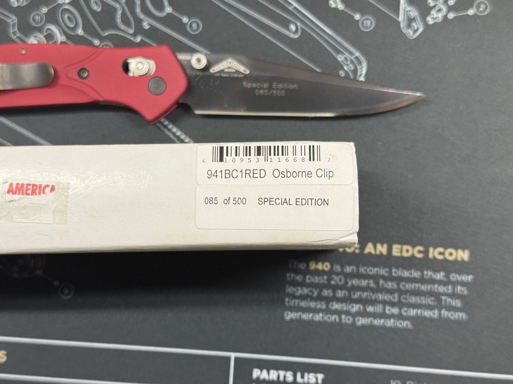 Benchmade 941BC1RED similar to the 940BC1RED but in the more sought after variant, the rare 941 -Unique Red Anodized Aluminum handle in 154cm steel with BC1 coated clip point blade - LNIB beautiful condition, no scuffs on the handle perfect collectors edition (some marks on blade edges since it has been sitting in the box since 2002 picture listed, simply strop the blade and they will disappear). It has been a safe queen since, with no cutting - box and sleeve included. Special Edition #085 out of #500, limited to #500 pieces, the number in circulation will drop over time with pieces getting harder to source since release of this particular 941 was in the year 2002. Please contact me with any questions! Thanks