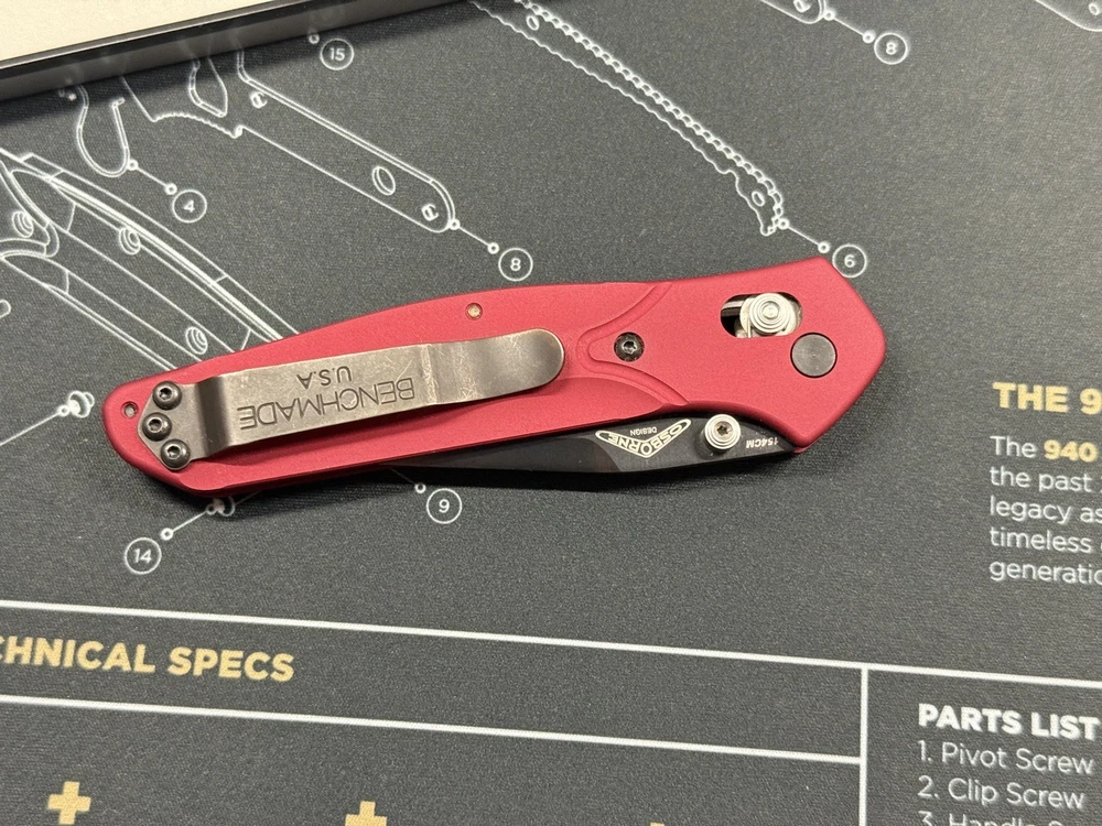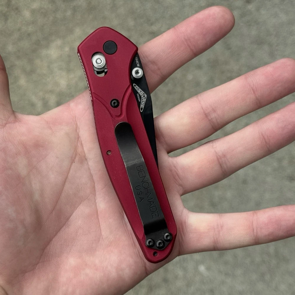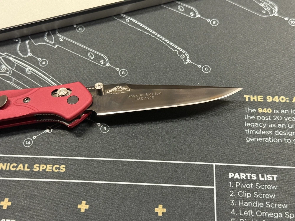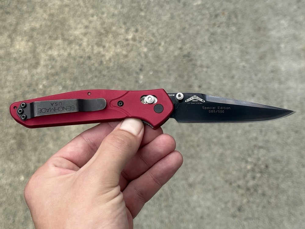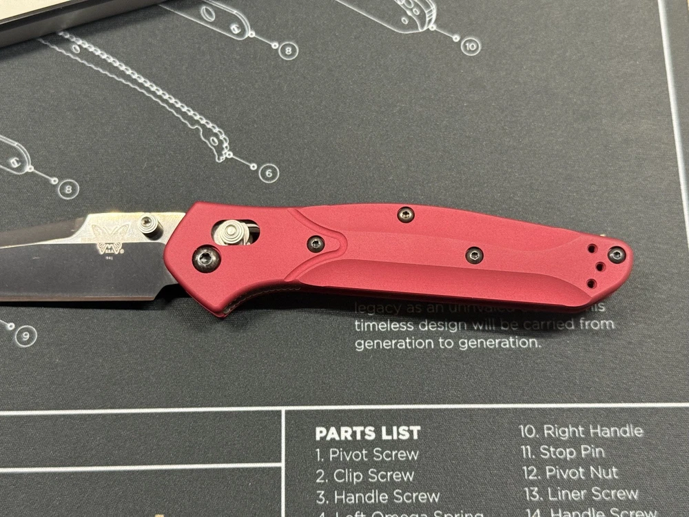 Benchmade 941BC1RED similar to the 940BC1RED but in the more sought after variant, the rare 941 -Unique Red Anodized Aluminum handle in 154cm steel with BC1 coated clip point blade - LNIB beautiful condition, no scuffs on the handle perfect collectors edition (some marks on blade edges since it has been sitting in the box since 2002 picture listed, simply strop the blade and they will disappear). It has been a safe queen since, with no cutting - box and sleeve included. Special Edition #085 out of #500, limited to #500 pieces, the number in circulation will drop over time with pieces getting harder to source since release of this particular 941 was in the year 2002. Please contact me with any questions! Thanks