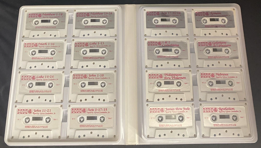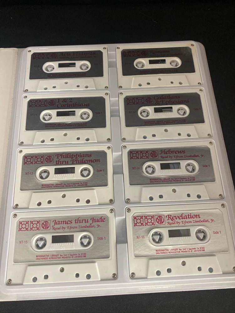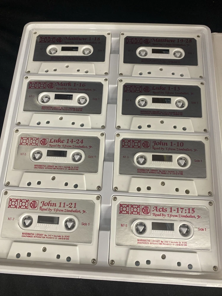 This Special Edition New Testament Read By Efrem Zimbalist Jr (1980, 16-Cassette Set) is a rare find for anyone interested in religion and spirituality. The audio play features the English language and is an abridged version of the New Testament. The set comes in a cassette case and is a non-fiction narrative type. It was published by Maranatha in the 1980s and is suitable for young adults and adults. The special edition attributes make this item a unique addition to any collection. In great shape. All tapes in working condition