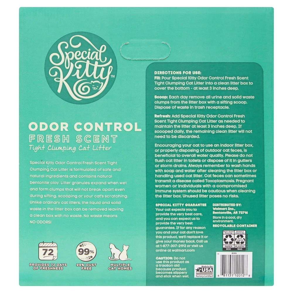 Special kitty fresh scent odor control tight clumping cat litter provides long-lasting freshness to keep your cat's area exactly that. Fill your cat's box with a fresh amount of litter and notice the difference immediately when you pour, as this litter, and special kitty promise, we know that cats rule, and are confident you would only provide the best cat litter. It is formulated of safe and natural ingredients and contains natural bentonite clay. Litter granules expand when wet and form clumps that will not break apart even during sifting, scooping, or your cat's scratching. Unlike ordinary cat litters, the liquid and solid waste in the litter box can be removed leaving a clean box with no waste. Long-lasting fresh-scented odor control to your home smelling fresh. The litter's tight clumping formula makes scooping a breeze. Recyclable plastic container. Provides up to 72 days of freshness. Great for multiple cat homes, this 40-pound box is optimally made to store away neatly and includes a handle hold for convenient maneuverability and easy pouring. Scent FRESH SCENT Animal Type Cat Animal Lifestage All Lifestages Container Type Jug Form Pebbles Color Green Brand Special Kitty Count Per Pack 1 Assembled Product Weight 42 lbs Product Line Special Kitty Manufacturer Part Number SPKY MC 40X Model SPKY MC 40X Size 40 lbs Assembled Product Dimensions (L x W x H) 7.72 x 11.97 x 13.19 Inches