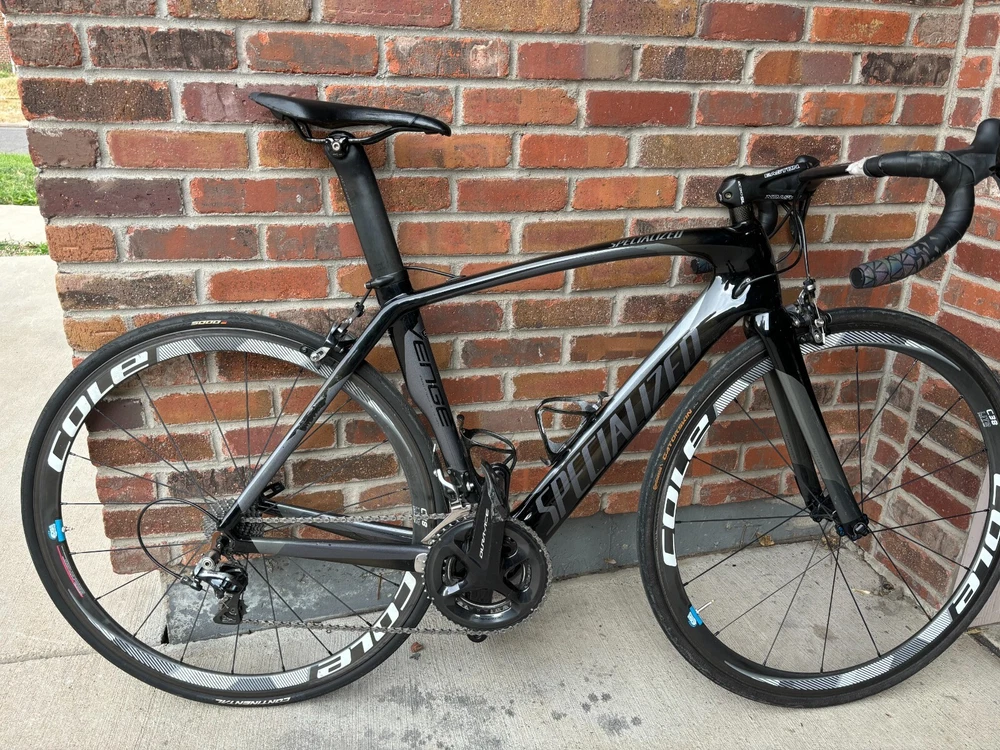 Specialized Venge with all the bells and whistles. Top of the line drive train, and 100 percent carbon. That's right, carbon wheels, carbon frame, carbon bars, carbon stem, even the derailleur is carbon. Nearing the UCI minimum weight, this bike is fast up the climbs, but has the stability and aero advantage making it and even faster on the way down. All professionally maintained. New chain with less than 30 miles on it. If you're still reading this, this is the bike for you. Send me a message. Specs: Full drive train including brakes: Shimano Dura-ace50/34 front, 28/11 cassette Frame: Specialized Venge Fact 10r carbon Wheels: COLE C38 Lite carbon wheel set with ceramic bearings Stem: Easton EC90SL carbon stem Bars: Easton carbon Aerobar AND brand new bar tape with Fizik bar gel for extra comfort.