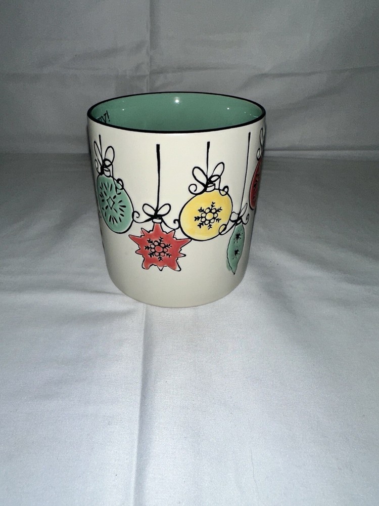 The Spectrum Designz 'Happy' Mug is a large ceramic coffee cup featuring round Christmas ball ornaments with an embossed and painted design. Manufactured in 2017, this 20oz mug is decorated in a multicolor all-over pattern, making it a festive addition to your holiday collection. Dishwasher and microwave safe, this contemporary mug is a cheerful choice for enjoying hot or cold beverages during the Christmas season.