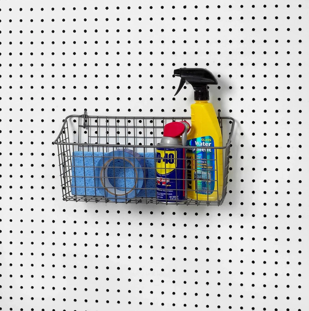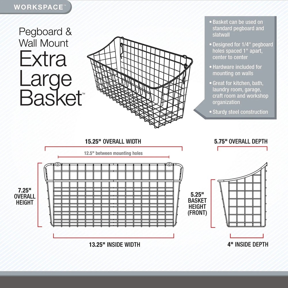 STORE TOOLS & SUPPLIES VERTICALLY: Streamline your organization with wall storage. Wire storage basket holds tools, craft supplies, hay for animals and remote controls. Utilize wall space to clear counters, drawers, benches, desks, and shelves. ARMS SLIDE INTO STANDARD PEGBOARD: Well-designed hooks utilize gravity to hang this organizer from pegboard or slatwall. Created for ¼" pegboard with holes spaced 1" apart, center to center. OPTIONAL WALL MOUNT: Comes equipped with optional holes for wall mounting the organizer. Included hardware designed for mounting on wood only; additional hardware and mounting systems may be required for alternative surfaces. QUICK & EASY INSTALLATION: Simply slide the pegboard hooks into holes on the same level, guide the arms upward, then gently release the tool holder and let gravity do the rest. Ensure tool organizer is level before placing tools inside. DIMENSIONS & CARE: 15.25" L X 5.5" W X 7.5" H; to clean, wipe with a damp cloth and towel dry. Maximize your wall space with the Extra Large Pegboard & Wall Mount Basket from Spectrum Diversified. Streamline your organization with wall storage. Wire storage basket holds tools, craft supplies, hay for animals and remote controls. Utilize wall space to clear counters, drawers, benches, desks, and shelves. Keep frequently used items organized and easily accessible. Well-designed hooks utilize gravity to hang this organizer from pegboard or slatwall. Created for ¼" pegboard with holes spaced 1" apart, center to center. Comes equipped with optional holes for wall mounting the organizer. Included hardware designed for mounting on wood only; additional hardware and mounting systems may be required for alternative surfaces. Great for kitchen, bath, laundry room, garage, craft room or workshop organization. To install on pegboard or slatwall, simply slide the pegboard hooks into holes on the same level, guide the arms upward, then gently release the tool holder and let gravity do the rest. Ensure tool organizer is level before placing tools inside. Made of sturdy steel.
