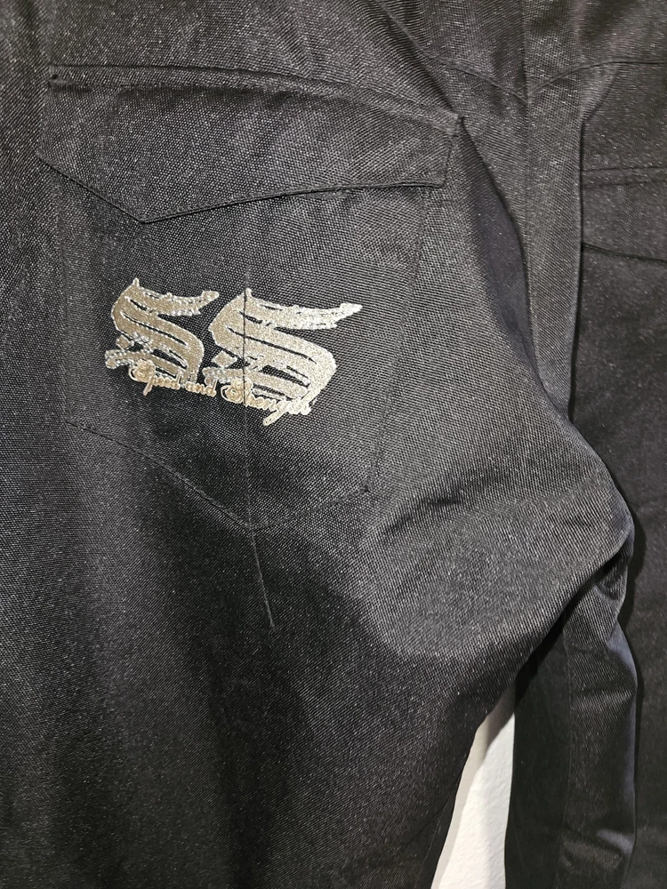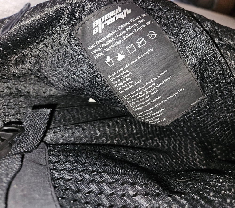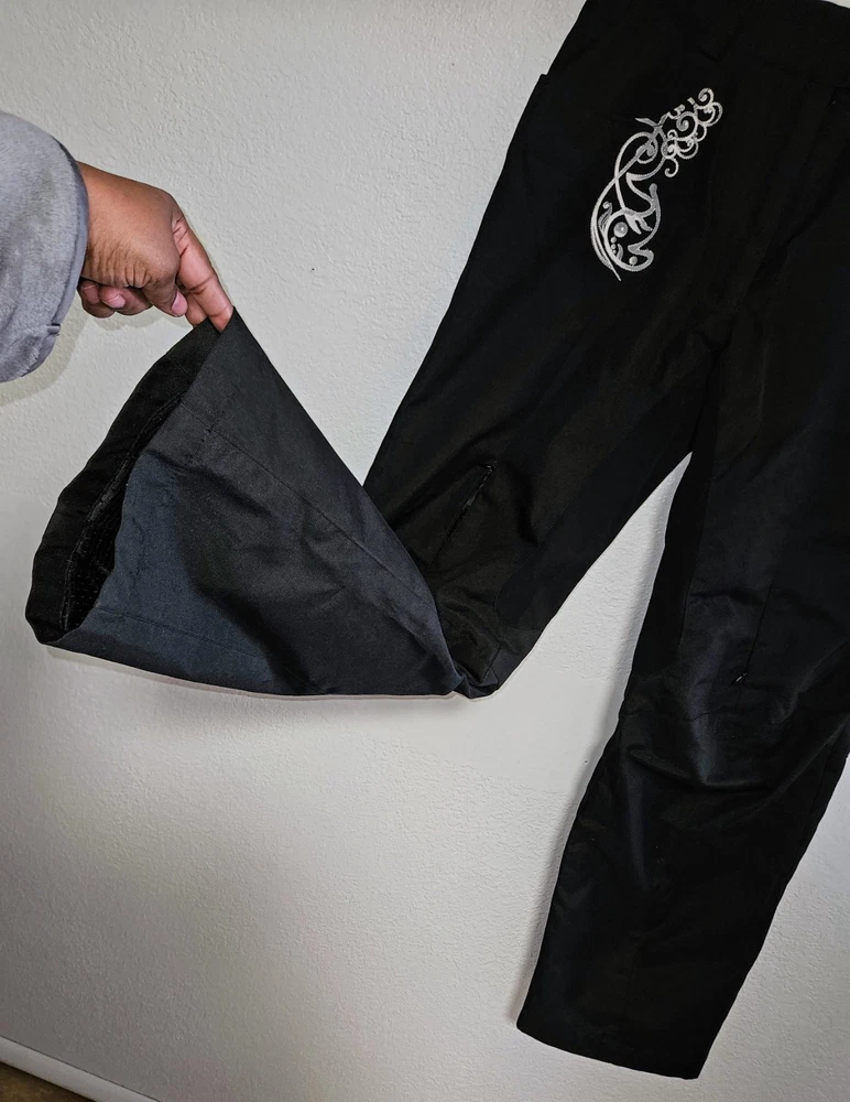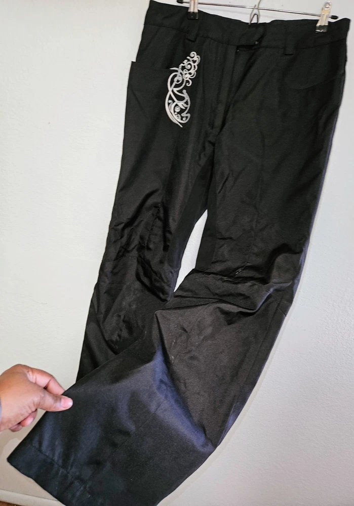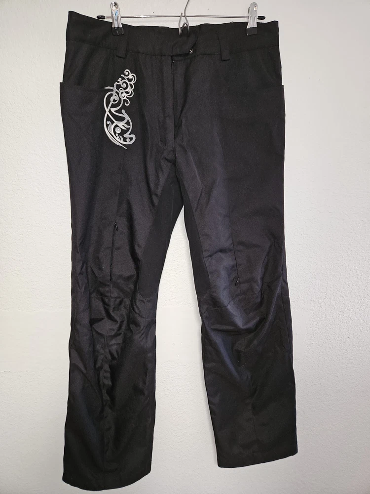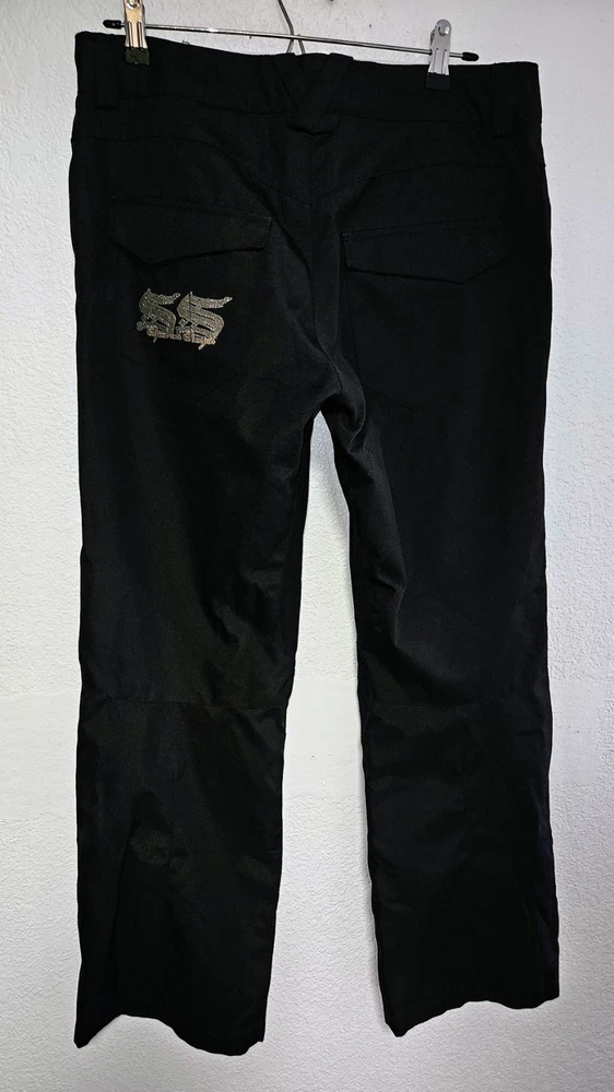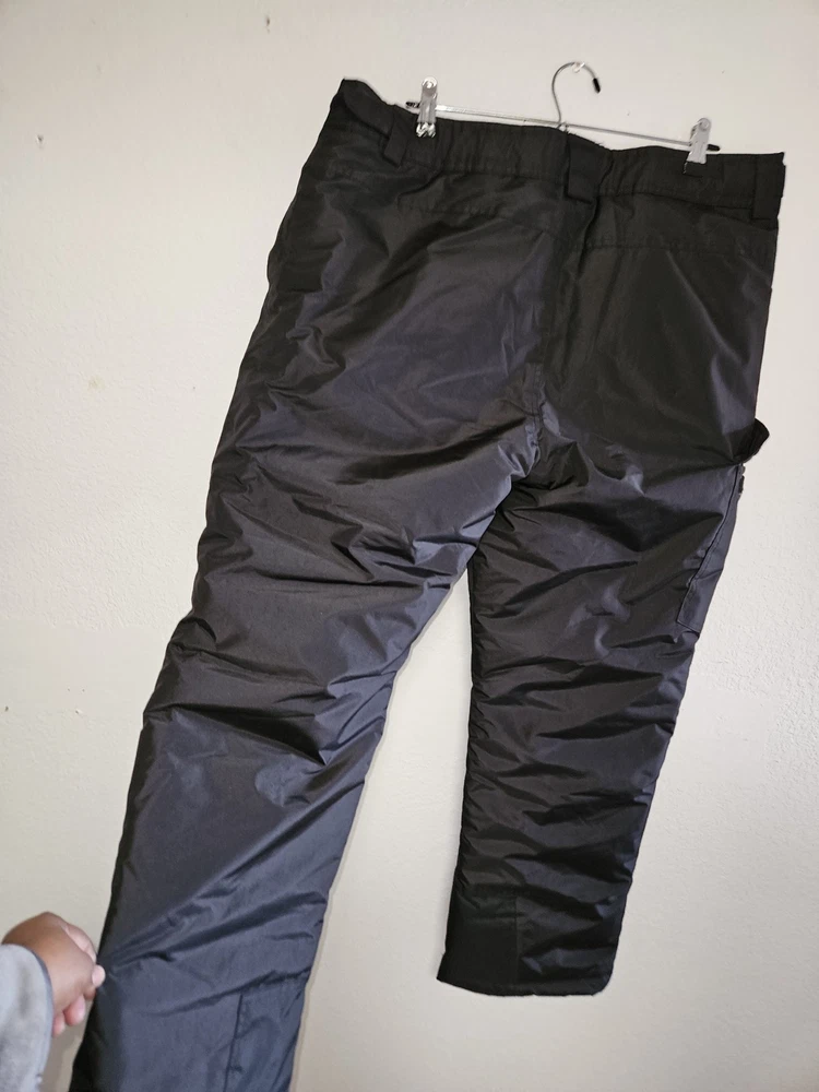 These black outdoor pants by Speed and Strength are designed for women in size L with a waist size of 38 inches and inseam of 38.5 inches. Made of polyester, the pants feature a solid pattern and a pull on closure for ease of wear. Ideal for activewear and outdoor activities in winter and fall, these snow pants are lightweight, insulated, water-resistant, windproof, and breathable. They also include features like ventilated panels, zip pockets, an elastic waistband, and adjustable waist for comfort and functionality during skiing or cross-training activities. Made in China, these pants offer both style and performance for outdoor adventures.