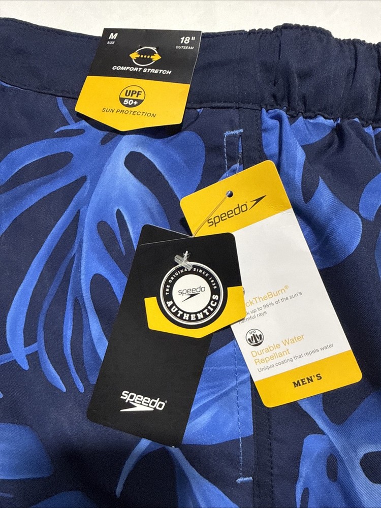 The product is a pair of Speedo Men's Blue Tropical Print Swimming Trunks in size Medium. These trunks feature a floral blue pattern, mesh lining, and are made of polyester blended fabric. They are machine washable and have a drawstring for a secure fit. Perfect for recreational swimming, these trunks also have pockets for convenience. The tropical theme adds a fun and vibrant touch to your swimwear collection.