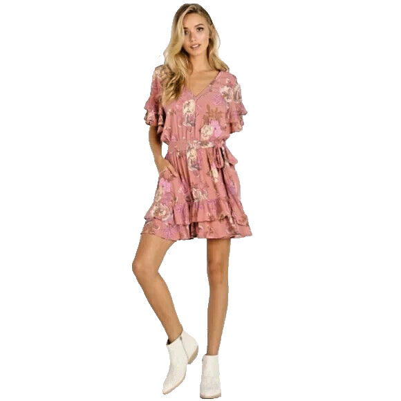 Rayon blend Hand wash cold Unlined Lattice trim and tiered ruffles Elasticized waist with tie detail Side slant pockets with lace trim Back keyhole with button closure Size XXS Excellent Pre Owned Condition Pit to Pit 15" Shoulder to Hem 28 1/2"