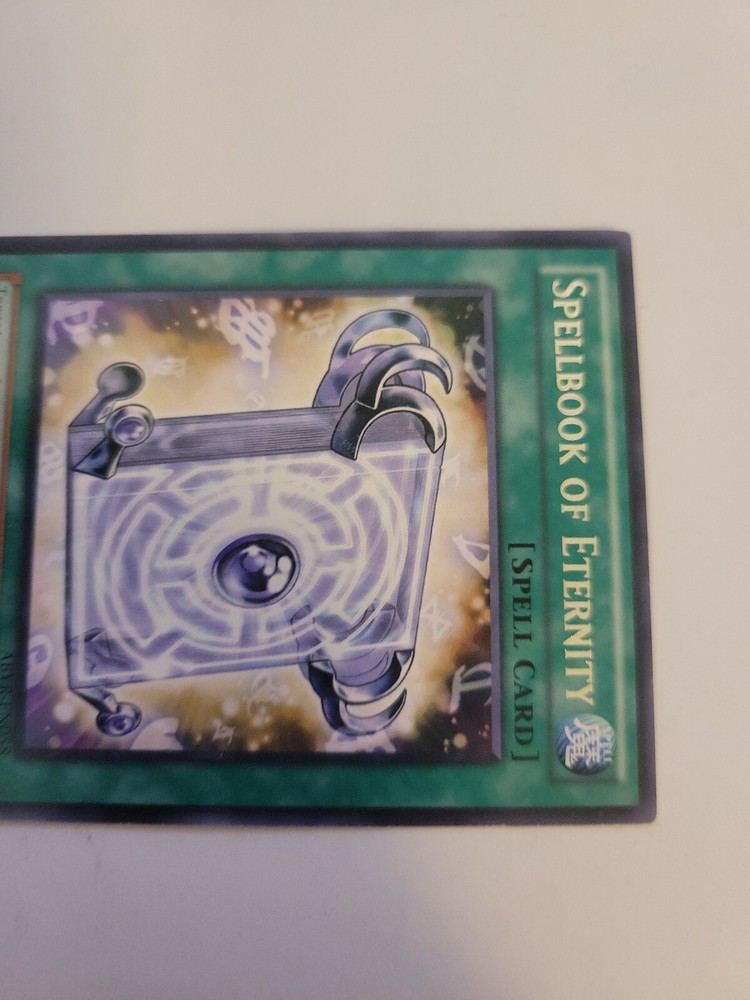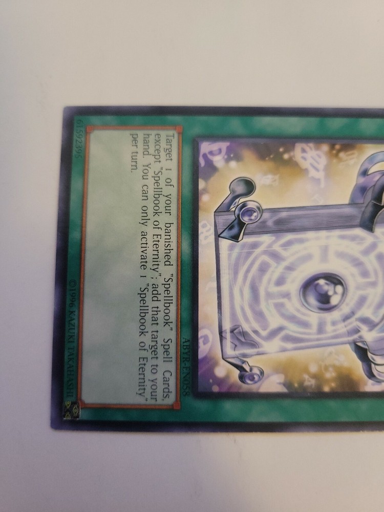 Features:UnlimitedAttribute/MTG:Color:SpellDefense/Toughness:0Card Type:Spell-NormalLevel:0brand:KonamiAttack/Power:0Rarity:RareAdditional Description:Spellbook of EternitySet:Abyss RisingCard Text:Target 1 of your banished "Spellbook" Spell Cards except "Spellbook of Eternity"; add that target to your hand. You can only activate 1 "Spellbook of Eternity" per turn.Manufacturer:KonamiLanguage:EnglishCard Name:Spellbook of EternityGame:Yu-Gi-Oh! TCGCard Number:ABYR-EN058