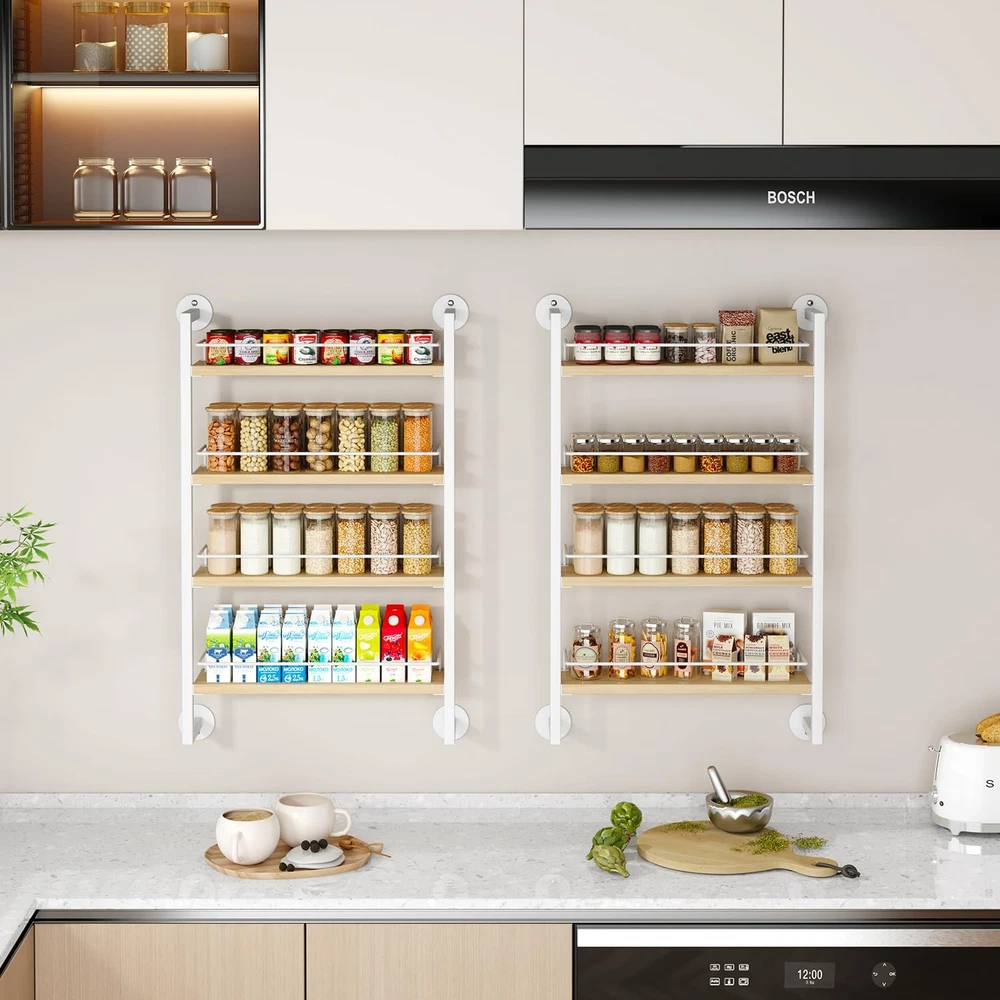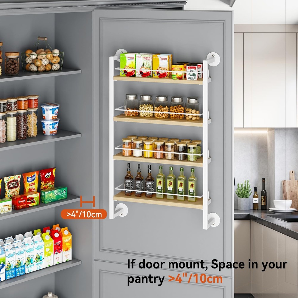 Spice Rack Wall Mount,4 Tier Hanging Seasoning Organizer,Spice Rack for Wall for up to 50 Jars,Spice Organization for Kitchen Cabinet,Living Room,Bathroom,Pantry,Natural TLJ016R LARGE CAPACITY: Each spice rack holds 80 4OZ seasoning jars,or 20 500ml seasoning jars, but also big bottles and cans.; use the wall-mounted spice rack to keep your spices perfectly organized and easily accessible at all times.The wall spice rack Size is 17.13"L x3.94"W x 29.13"H. WOODEN SPICE ORGANIZER: spice rack is made of 4 layers of chipboard and metal frame, with strong and stable structure and stylish appearance. The vintage look suits any room decor style and makes your kitchen or pantry look fabulous.Compared with most products on the market, our spice rack is more sturdy and durable with large capacity to meet your different needs. MULTIFUNCTIONAL SPICE STORAGE: Mount the spice rack on the wall or hang the spice organizer on the pantry or cabinet door. In the kitchen, it can organize your desired spice jars, tea bags, etc.; in the bathroom, you can use it to organize toiletries, cosmetics; in the living room, you can use it to organize snacks, medicine bottles; choose to place these space-saving kitchen spice racks according to your needs and keep your home and kitchen free from clutter. ROBUST AND RELIABILITY: Our spice racks have added side guards and bottom fixing discs to ensure safety and stability. The guards prevent spices from falling. Compared with most products on the market, our spice racks are more durable and have a large capacity to meet your different needs. EASY TO INSTALL: Our spice rack organizer is very easy to install. You just need to fix the product on the wall or door with the included screws. Detailed installation manual and installation tools are provided to help you complete the installation quickly. If you encounter any problems, please contact us and we will assist you to solve them.