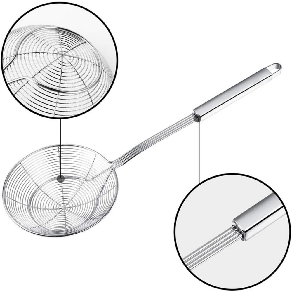 Spider Strainer Skimmer, Swify Stainless Steel Asian Strainer Ladle Frying Spoon with Handle for Kitchen Deep Fryer, Pasta, Spaghetti, Noodle, 5.5 Inch About this item Stainless steel spider strainer: our strainer Skimmer is made of 304 high quality stainless steel, which is more solid and durable than the similar strainer, sturdy outer framework and handle, hardly damaged, offer you the best durability and using experience. Long handle strainer: total length: 15. 7Inch(40cm); the scoop diameter: 5. 5Inch(14cm); the handle length: 10. 2Inch(26cm); the perfect length to protect your hand and arm from boiled water or oil while not exhausting your arm. Wired strainer Spoon: the spider web bowl helps you take food out of hot oil or water safely, catches food securely while releasing oil and and other residue. Perfect for frying foods, like potato chips, chicken legs, and scoop up noodles, spaetzli, pasta, spaghetti and more. Easy to clean & store: non stick stainless steel strainer is easy to clean, just flushes with soapy water or throw it into dish washer. Skimmer strainer designed with convenient hanging hales, it can be hung on the wall After use, to keep dry and clean. Easy to storage and easy to quickly grab. Satisfaction : We provide 100% Satisfaction : "risk free" with free returns & exchanges, 30 days hassle-free money back , 12 months , 24H friendly service team. Product Description Swify Durable Stainless Steel Spider Strainer An excellent strainer is an essential in every good kitchen; Allows you to fry and cook food in a proper and safe way in hot oil or boiling water. Perfect for frying foods, like potato chips, chicken legs, and scoop up noodles, spaetzli, pasta, spaghetti and more. Secure your hands while cooking large amounts of food for a long time, making the tedious and cumbersome cooking tasks safe and easy to operate. Hanging hole at the end of the handle, which can be hung on the hook on the wall making it convenient to store and use. 304 Stainless Steel Long Handle Hanging Holes Large Strainer Bowl Easy to Clean Easy to Store Dishwasher Safe Durable Food Grade Strainer Our strainer made of 304 stainless steel material, which is heat-resistant and rustproof, totally safe in high-temperature oil and water. 4 side-by-side crafted attachment between the handle which is much durable for daily use, compared to plastic or other materials in the market. Double Coil Design Upgrade Double Coil design spider strainer is much increases the stability of the entire filter. The deepened strainer can scoop more food at a time. Uniform spider web shaped strainer design maintains the maximum the speed of draining, can be used for draining variety of food from deep frying to cooking. Long Handle Strainer The long handle designed to protect your hand and arm from boiled water or oil. Hollow Design handle which is heat resistant and more convenient to handle and use feeling no fatigue when cooking. Has a built-in hanging hole for conveniently store and use.
