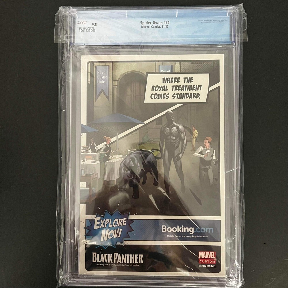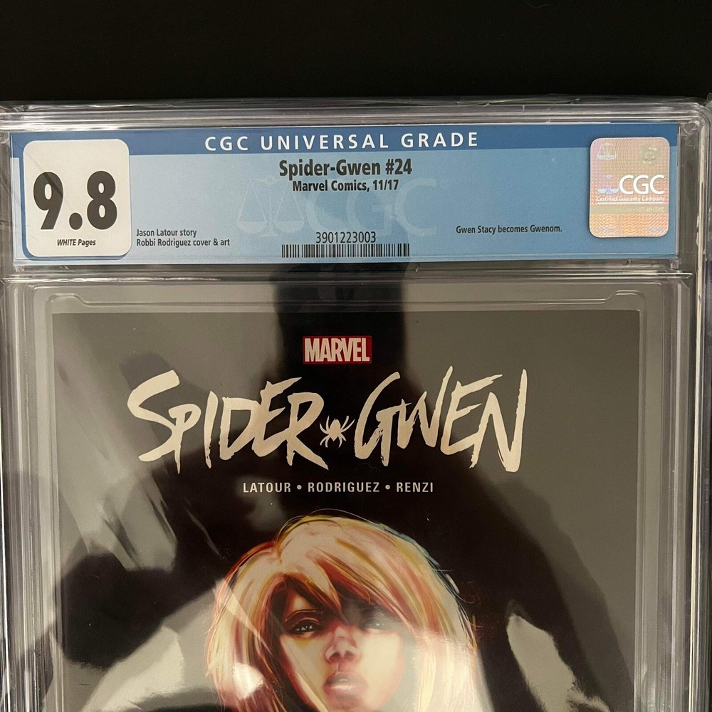 This Spider-Gwen #24 comic book is a rare piece for collectors and enthusiasts alike. It features the first appearance of Gwenom and has been professionally graded by Certified Guaranty Company (CGC) at 9.8 Near Mint/Mint. The single issue comic book is a first printing and was published by Marvel Comics in 2017. The comic book is part of the Spider-Gwen series title, which is set in the Marvel (MCU) universe and falls under the genre of superheroes. It is a US Comics tradition and has been authored by Jason Latour and Robbi Rodriguez, who also serves as the cover artist. The Unit of Sale is a single unit and the comic book comes with no certification number.