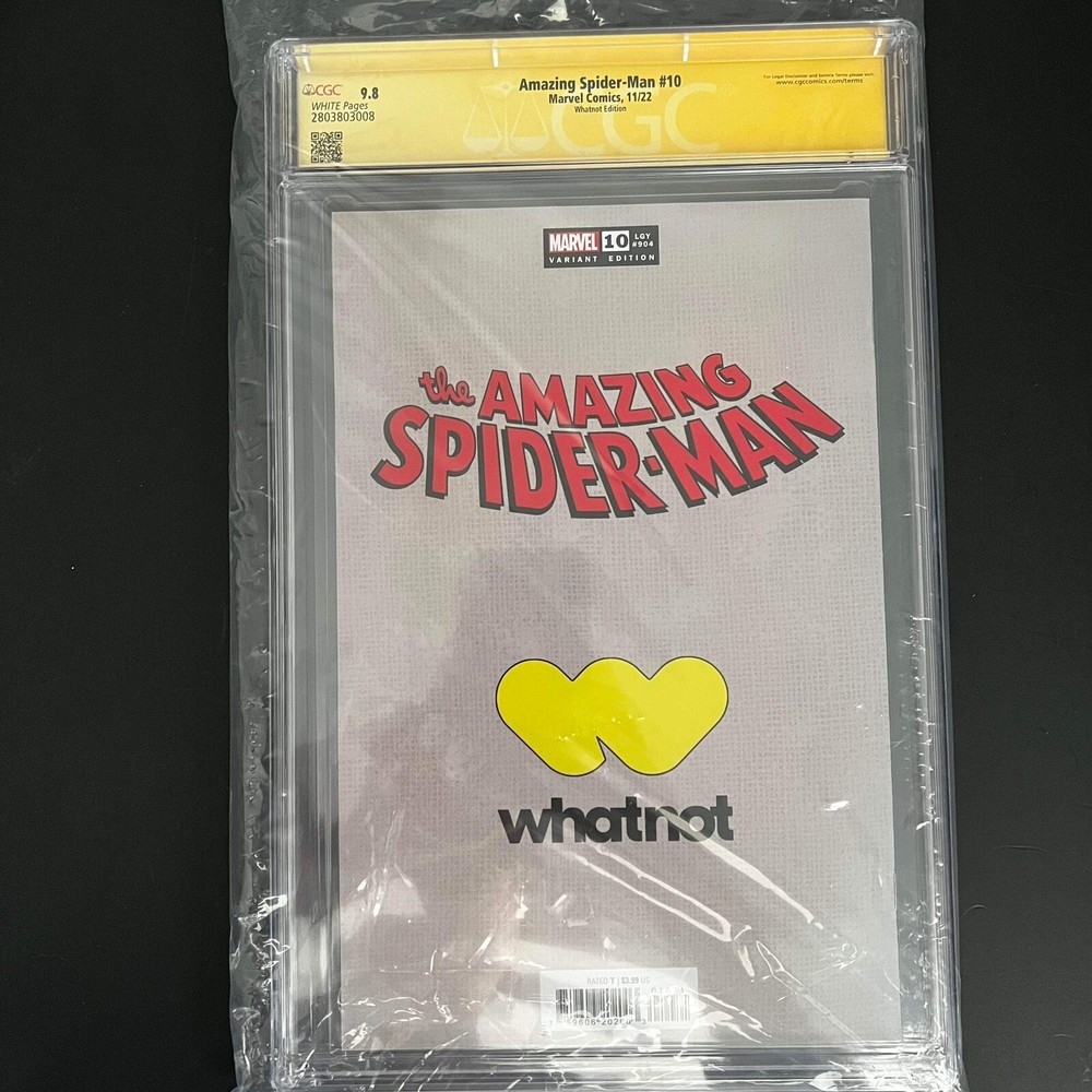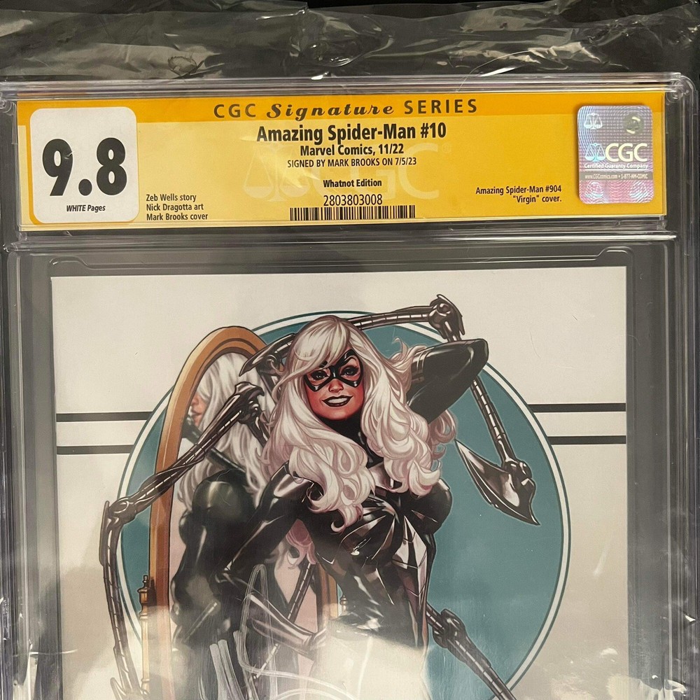 This limited edition Spider-Man comic book features a stunning virgin variant cover signed by legendary artist Mark Brooks. The comic has been graded by Certified Guaranty Company (CGC) with a 9.8 Near Mint/Mint grade, ensuring its pristine condition. The comic is a single issue from the Amazing Spider-Man series, issue number 10, published by Marvel Comics in 2022. The comic book is perfect for fans of Spider-Man and Black Cat, and is a great addition to any collection of comics and graphic novels. The variant cover features striking colors and a custom label that will make it stand out among other comic books. The comic is suitable for general audiences and has not been personalized or inscribed. Don't miss your chance to own this rare and valuable piece of comic book history!