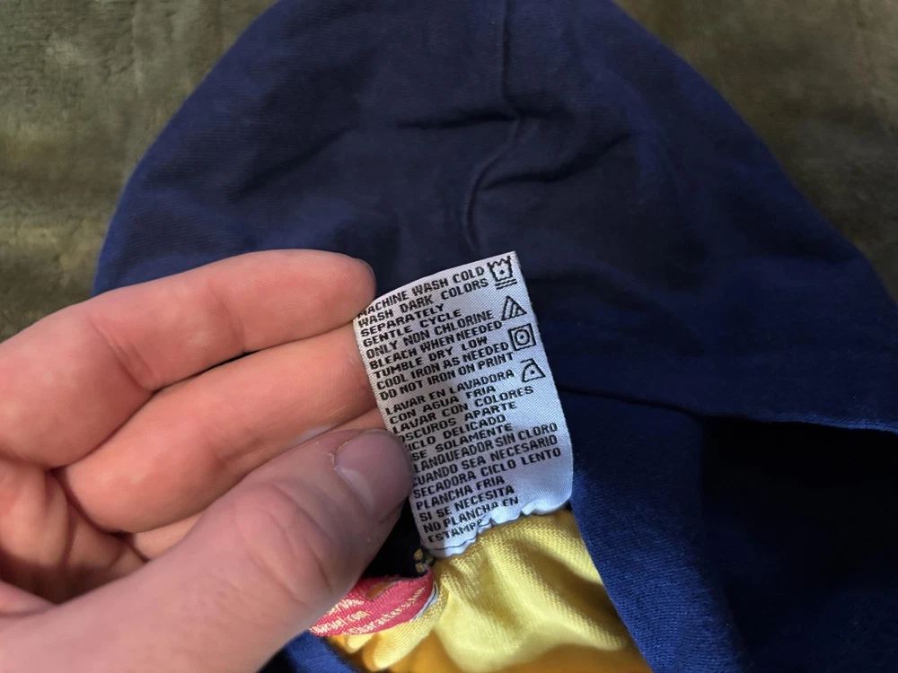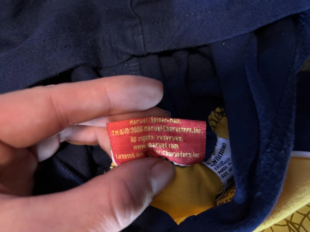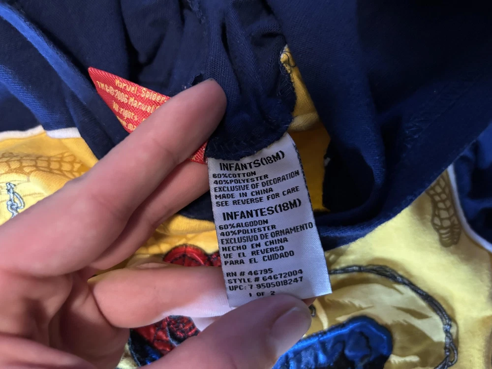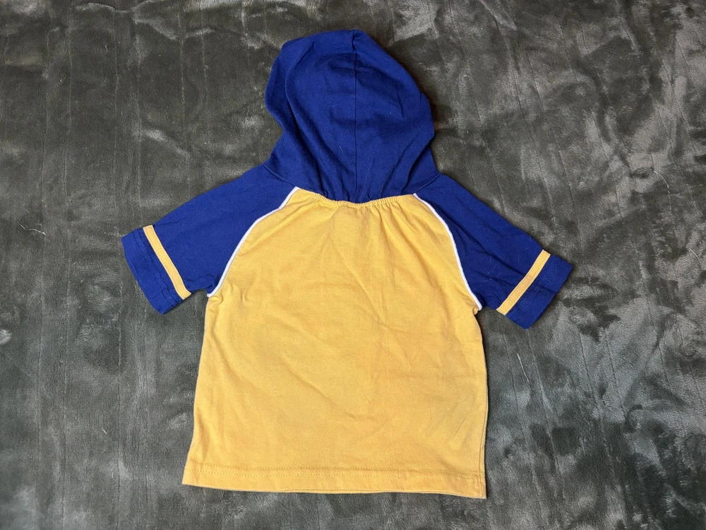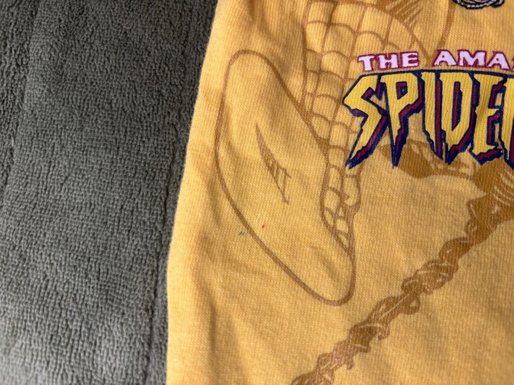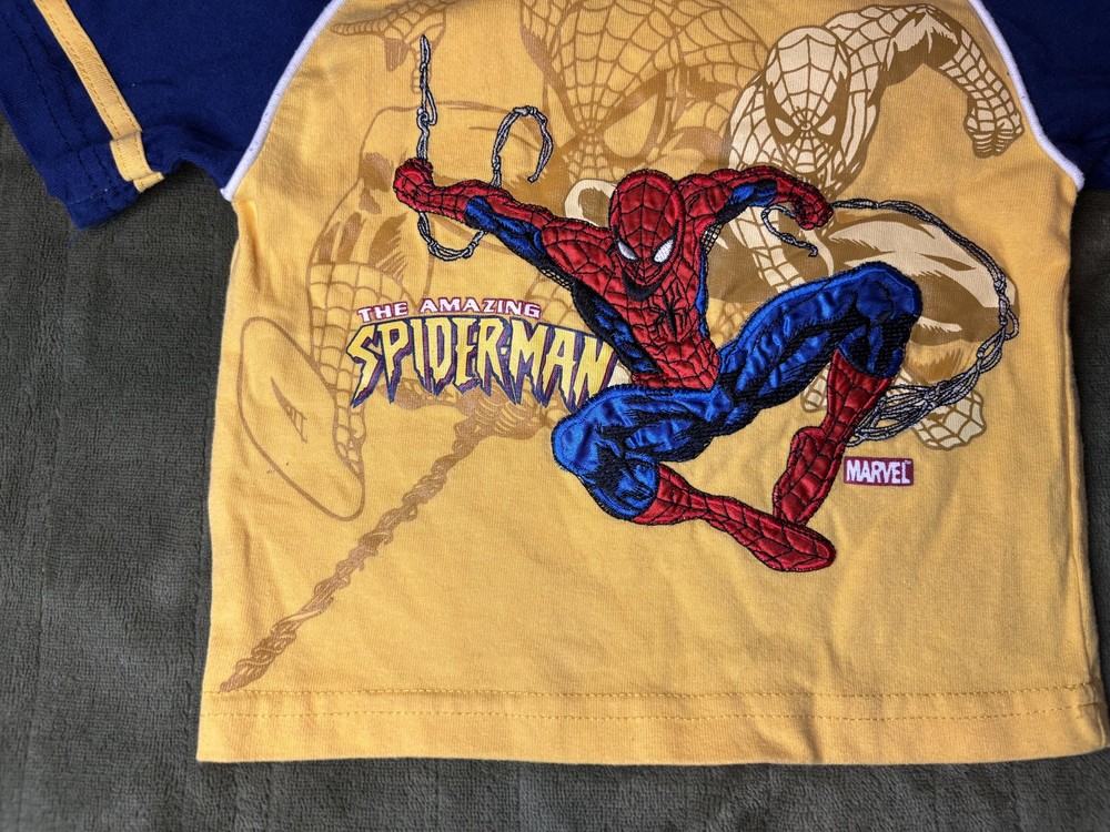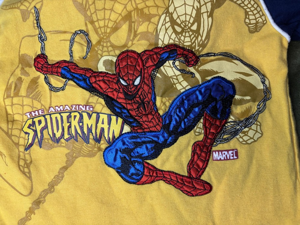 Brand: Spider-Man / Marvel Style: Boys hooded short sleeve graphic shirt with pullover design Size: Infants 18M (approx 18-24 months) Material: 60% cotton, 40% polyester; yellow body with blue hood and sleeves and white piping trim Design details: Front features large embroidered and printed The Amazing Spider-Man graphic with swinging Spider-Man artwork and Marvel logo, contrast sleeve cuffs with yellow stripe, soft knit hood Tag details: Made in China; RN 46795; style #64672004; UP #9550518247; 2006 Marvel Characters, Inc. Care: Machine wash cold with like colors, gentle cycle, tumble dry low, do not iron on print Keywords: Spider-Man shirt, boys hooded tee, Marvel superhero top, toddler graphic T-shirt