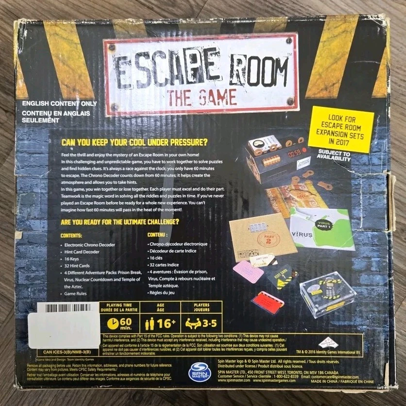 Get ready for an exciting adventure with the Spin Master Games Escape Room board game. This complete game is perfect for 3 or more players and is designed for boys and girls aged 16 and up. The game's theme is escape, and it features challenging puzzles and riddles that will put your problem-solving skills to the test. The game includes components from the trusted Spin Master brand and is a great addition to any board game collection. With its contemporary manufacture, it is sure to provide hours of entertainment for players of all skill levels. Get ready to embark on a thrilling journey with Escape Room, the ultimate challenge for your mind!