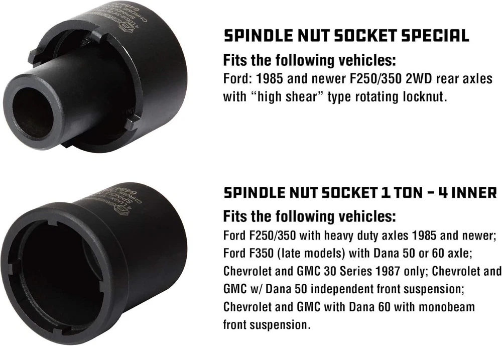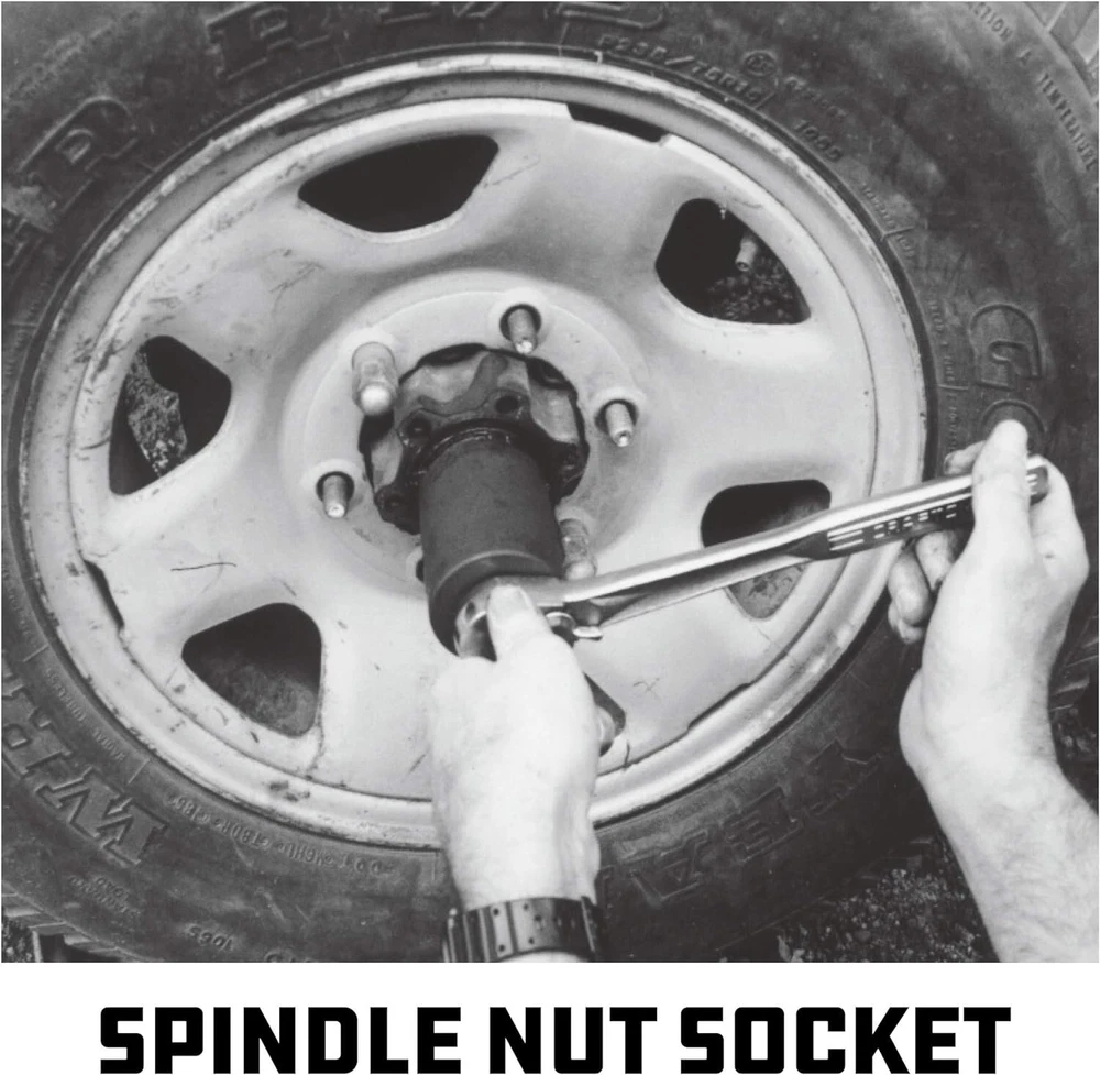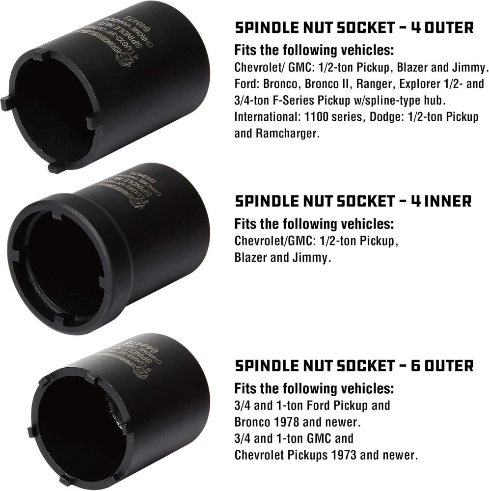 Spindle Nut Socket Tool Kit, 5 Piece, Remove Spindle Nuts, Various Size Lug Out Spindle Sockets, Size Markings, Storage Case - 648636, Black Made to be the most reliable tools in the market today Tool solutions for most all situations Built to exceed tool standards Tool set for removing spindle nuts Impact rate 6-Point chrome vanadium sockets The right tool for the job Storage case includes usage photos Kit 11 includes 5-Piece for removing spindle nuts For removing and installing front axle spindle nuts. Includes: 2-3/4-in x 4 lug outer 2-5/8-in x 6 lug outer 2-3/8-in x 4 lug outer 2-1/2-in x 4 lug inner 2-1/4-in x 4 lug inner. 1/2-in square drive for use with breaker bar/torque wrench. Storage case complete with laminated instruction sheets with photos. Meets or exceeds ANSI standards. Any specialty tool will help make an automotive repair or maintenance task easier, but products take the concept of 'help' a big step further. Every package comes with professionally written usage instructions that take you step by step through proper tool usage. And photographs of the tool in use accompany the instructions. All developed by an automotive professional who writes and edits automotive service manuals. Millions of products are used every day around the globe, on the job, at home and in the garage. tools are built with the performance, features, fit and finish to satisfy the most demanding users. No matter which tool you select, you will enjoy the added confidence of knowing that all tools and equipment meet or exceed applicable standards set by the US Government and American National Standards Institute (ANSI). Ready to get serious? Get tools! From the Manufacturer Each kit includes step-by-step usage instructions and photos showing the tool in use. Instruction sheets are laminated to resist staining and are permanently fastened to the case. All instructions are developed by a professional repair manual writer. Kit 11 tools are for removing spindle nuts. The sockets are impact rated 6-Point chrome vanadium sockets.