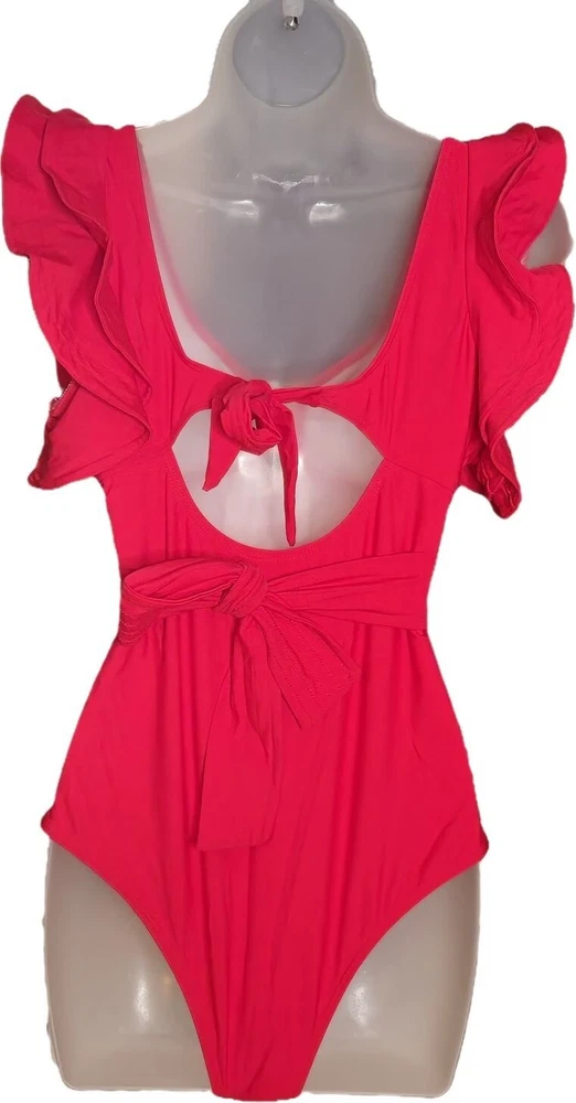 This swimsuit features a vibrant red hue with a sophisticated V-neckline and elegant ruffle sleeves. A stylish cut-out back design is tied with a bow, adding a touch of flair. Suitable for beach outings and poolside relaxation, it offers a blend of comfort and style. • V-neckline with gold accent • Ruffle sleeves • Cut-out back with tie closure • Stretchy and comfortable fit Features: • Gold Metal V Accent • Tummy Tuck Swimsuit • Figure Flattering • Lined, Built in Bra w/ Removable Cups Size: Womens Large Measurements: Across Chest 16 in / 41 cm Across Waist 15 in / 38 cm Across Hips 17 in / 43 cm Total Length 28 in / 71 cm Condition: New With Tags NWT No Smoking Workspace Please review all photos closely before purchase, buy responsibly, thank you. Please read the description for further details and measurements, Thank you!