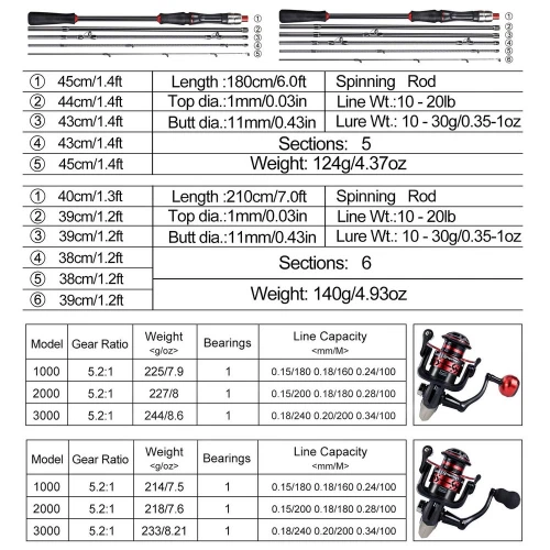 Fishing Rod: 1.Lure W: 10-30g/0.35-1oz 2.Line W: 10-20LB 3.Material: glass fiber + alloy 4.Sections :5 /6 5.Length:180/210cm 6.Weight: 124/140g Fishing Reel: 1.Type: Spinning Fishing Reel 2.Series: 1000-3000Series 3.Color: Red/Gold 4.Gear Ratio: 5.2:1 5.Weight: 225g 227g 244g Package include: 1 * Fishing rod 1 * Fishing reel 1*Fishing line Tariff Delivery details Feedback Return /Refund Contact us Tariff Paying tax is the duty of every citizen, buyer need to responsible for the all of taxes. Due to the tax problem, buyer refuse to receive the goods, buyer need to Responsible for freight out and home. Delivery details 1. Delivery time: We send by China Post Air Mail in Default. (20-60 days for different cournties, Brazil sometimes needs 90days). We send by Epacket to USA about 7-15 days. 2. For fast delivery, please choose EMS (7-10 days), for Russia and Brazil, it needs 10-15 work days. 3. We guarantee to ship out within 15days after payment confirmation (except Holiday). 4. Our shipping rates include the cost of shipping, handling, packaging and related manpower costs. 5. Please contact us If you don't receive over above business days,we will solve this problem in a very short time. 6. Please make sure the shipping address is correct. We are not responsible for any wrong or undeliverable addresses. Feedback 1.We depend on our aliexpress reputation and customer satisfaction to succeed. Therefore, Your feedback and DSRS are extremely important to us as better DSR scores affect our search; placement on aliexpress. 2.If you love my items please leave me good feedback and 5 star DSR rating. Your action will help us offer our milk and bread . I will do the same for you .If we have not given you reason enough for 5-star grades on each DSR then please let us know how we can earn your 5-star rating before submitting your stores! Return /Refund 1. We will check the goods quality before shipment. If there are some unexpected problems happen, we hope to solve the problems with buyer through friendly in the following ways: (1) If it is quality problem, buyer can contact us after receiving the goods, buyer can help to provide photos or video and other evidence to help us to solve the problems. (2) Man-made damaged, buyers take full responsibility. (3) If the cusomers do not satisfy with the products, the buyer return the goods in original conditon to us; after we receive the goods ,we will send a new product to buyer or refund the money. But shipping fee is not refundable. And the item should be returned to us in its original condition by mail with tracking number. 4. Any question you would like to ask ,welcome to email us Contact us All emails will be answered within 24 hours. If you do not receive our reply, please kindly re-sent your email and we will reply you as soon as possible. If you email us and don't hear a reply, please email again through the aliexpress system as sometimes our mail servers have errors Because of the new rule of Russia post office, When make an order, Russia customers have to write the Full name(a surname, a name and a middle name), or the packages would be sent back . No full name, we will refuse to send goods out! thanks! Thank you for your coming to our shop!!!
