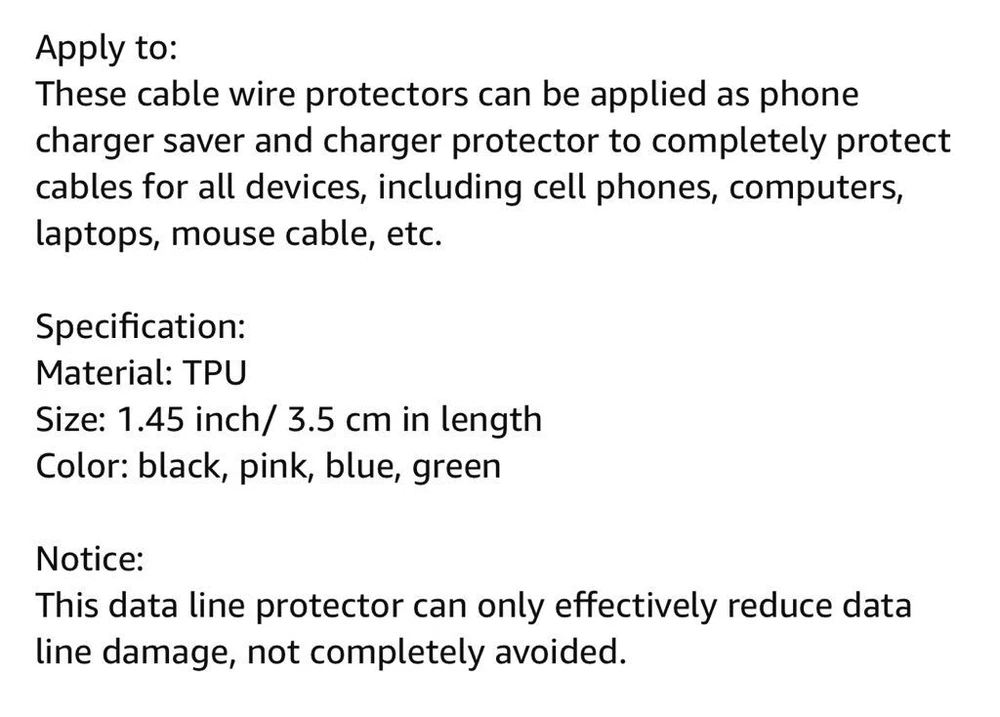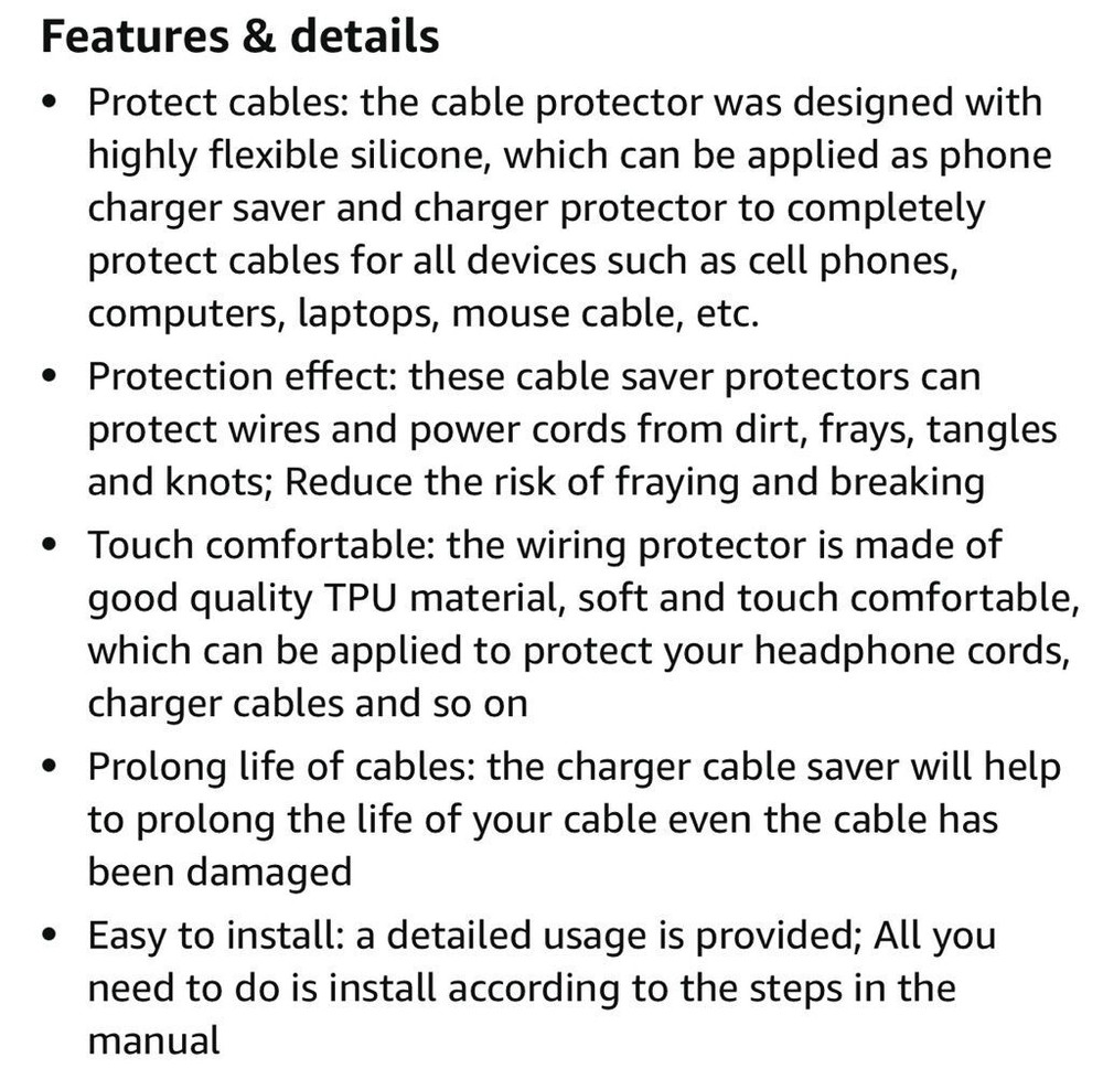 NEW/Unused - 12 Pack Flexible Silicone Spiral Cable Charger Wire Protector and Saver. * Prolong life of cables: the charger cable saver will help to prolong the life of your cable even the cable has been damaged. For all devices such as cell phones, computers, laptops, mouse cable, etc * Easy to install: a detailed usage is provided; All you need to do is install according to the steps in the manual * Size: 1.45 inch / 3.5 cm in length