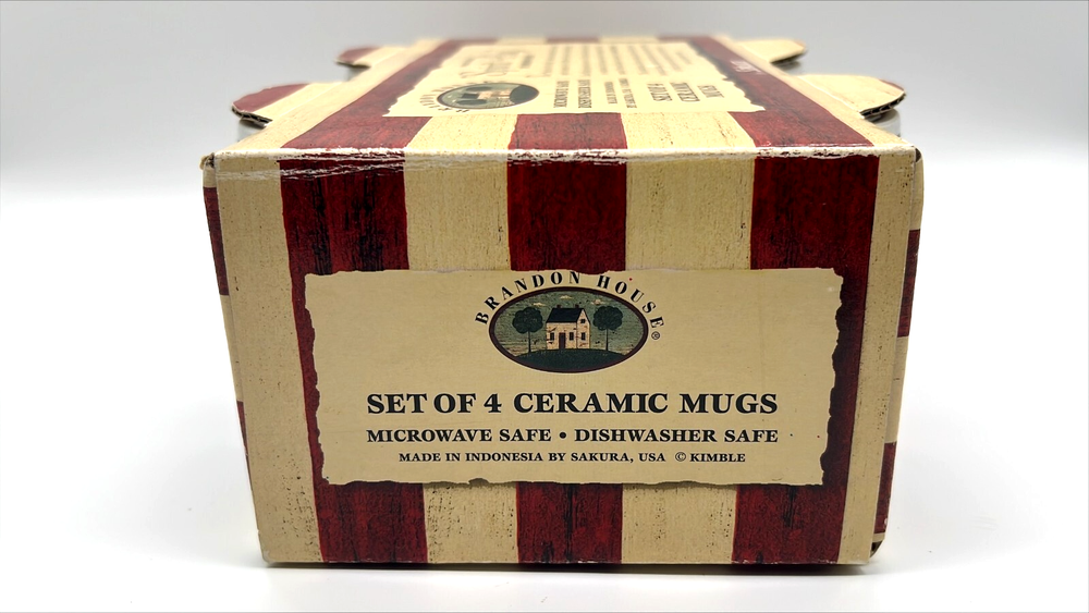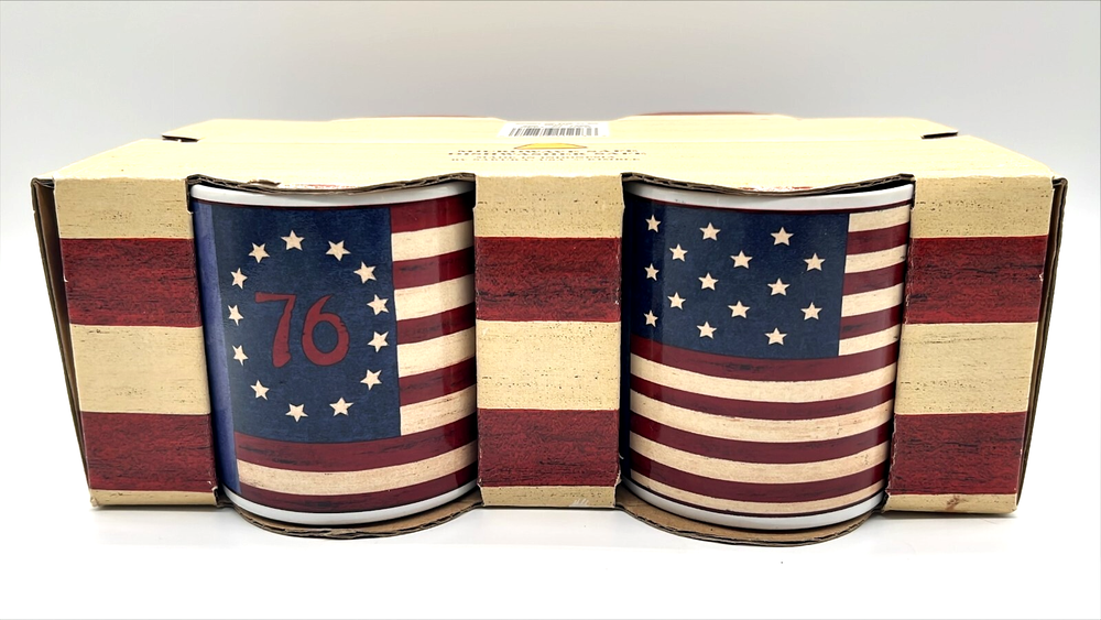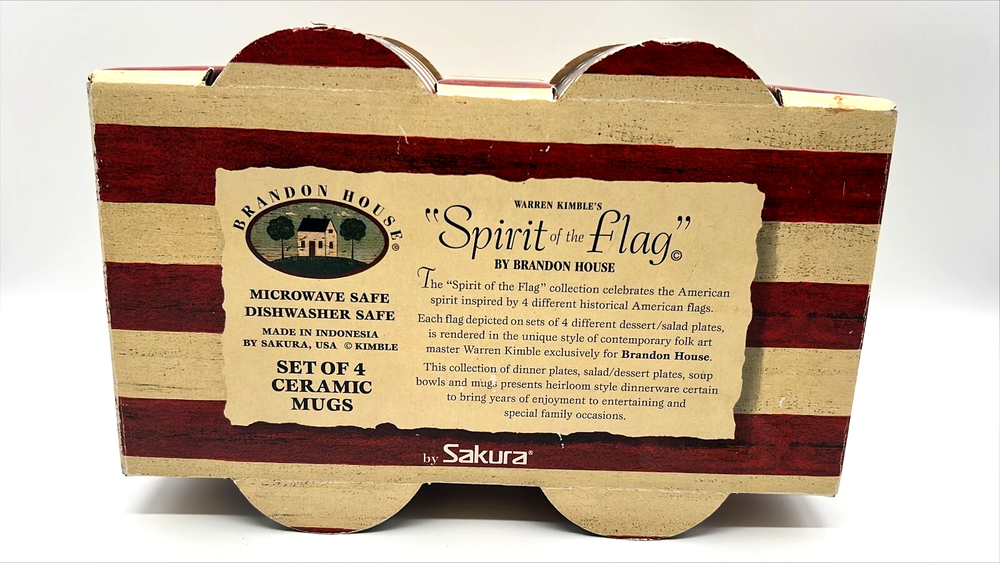 The Spirit Of Flag Mugs Brandon (4) House Warren Kimble Sakura USA America Patriot is a set of four ceramic and porcelain mugs featuring a patriotic American theme. The mugs have a round shape and a multicolor striped pattern, perfect for July 4th or any occasion. They are machine washable and microwave/dishwasher safe for easy use. Made by Sakura under the Brandon House franchise, these mugs are a great addition to any American-themed kitchen collection.