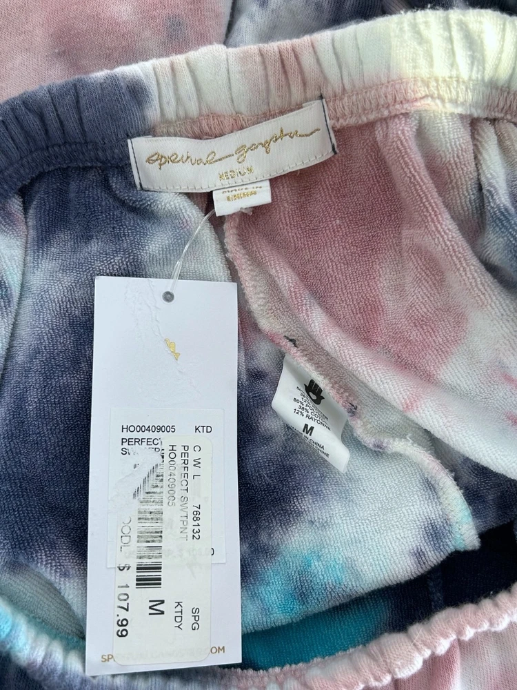 NWT MSRP $108! Spiritual Gangster PERFECT KALEIDOSCOPE TIE DYE SWEATPANTS Each pair is unique in its own dyed pattern! Multicolored tie dye print allover Elastic waist and ankle cuffs Soft blended fabric High waisted Terrycloth blend lined Super soft and cozy Made with cotton/polyester/rayon Hand dyed in China Women’s medium Waist: 13” across Inseam/ 26” around unstretched Inseam: 24” Rise length: 12” Full length: 36” #spiritualgansgter #spiritualgangstersweats #tiedye #tiedyesweatpants #terryclothsweatpants #terrycloth #tiedyed #cozycore #comfy #loungewear #casual #anyoccasion