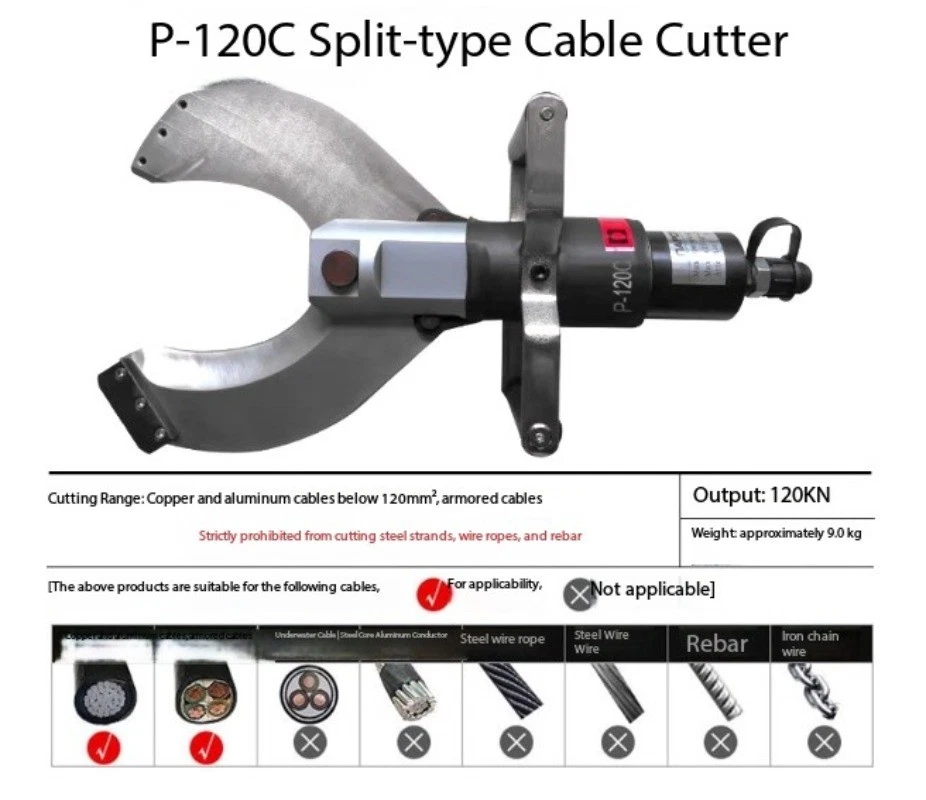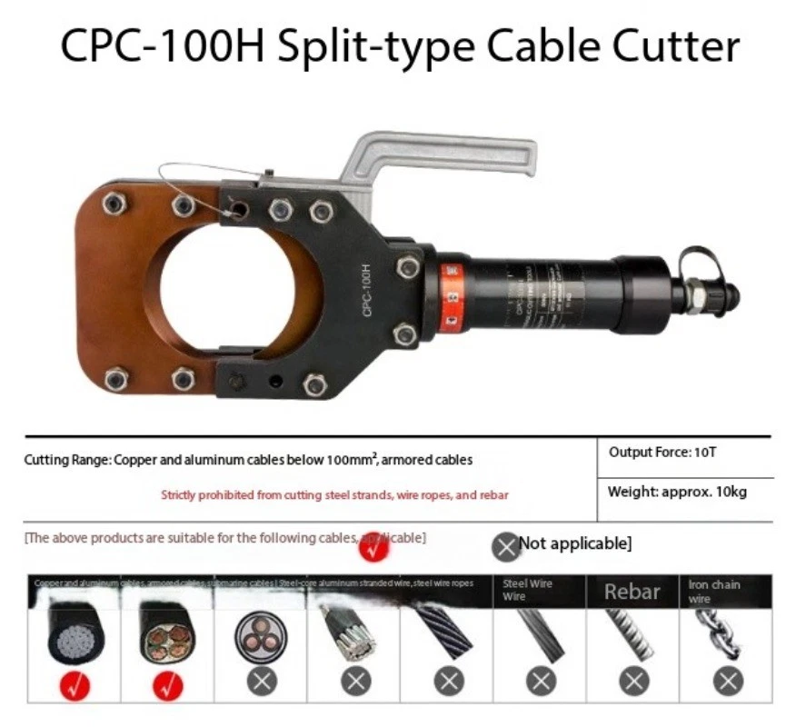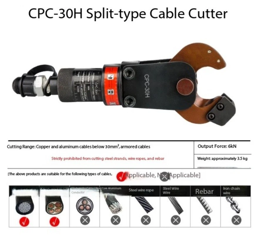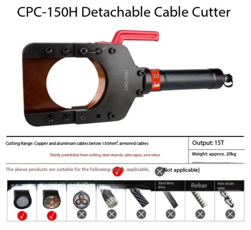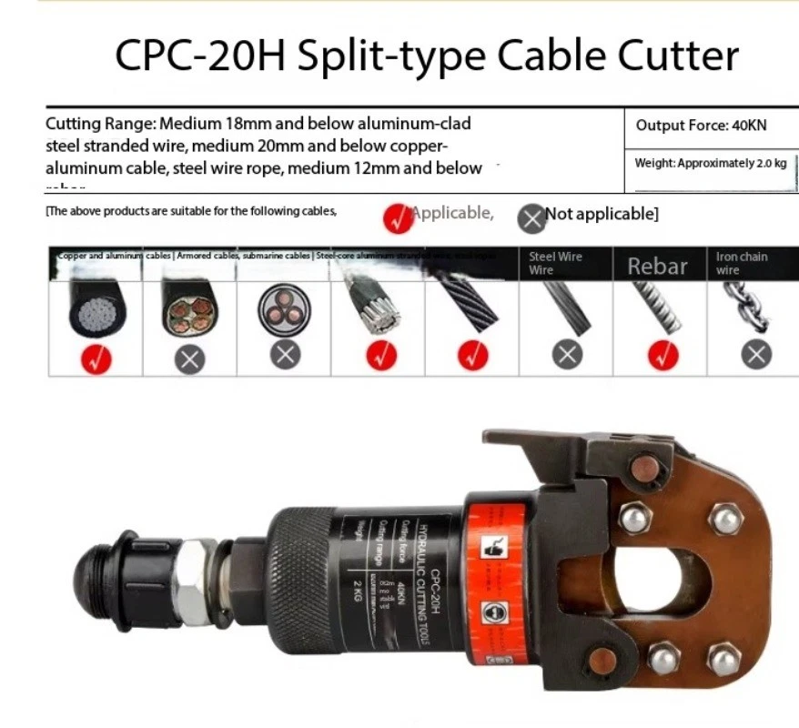 Split-Type Hydraulic Cable Cutter Hydraulic Cable Shears Electric-Hydraulic Cable Cutter Detachable Hydraulic Shears CPC-30H Split-Type Cable Cutter CPC-30H Cutting Range: Copper/aluminum cables under φ30mm, armored cables Strictly prohibited from cutting steel strands, steel ropes, or threaded steel bars Cutting Force: 6 kN Weight: Approx. 3.5 kg CPC-20H Split-Type Cable Cutter Cutting Range: Steel-core aluminum stranded wire ≤φ18mm, copper/aluminum cable ≤φ20mm, steel wire rope, rebar ≤φ12mm Cutting Force: 40 kN Weight: Approx. 2.0 kg
