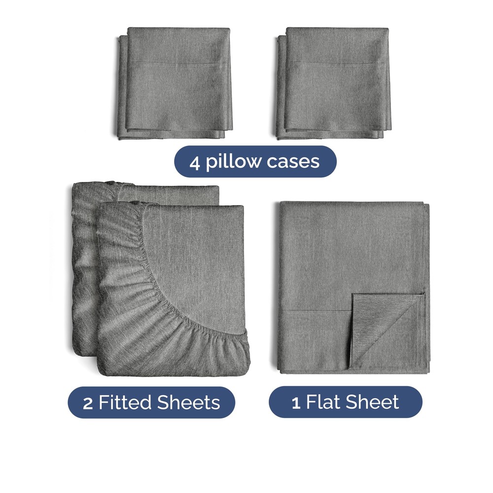 7 PIECE BED SHEET SET: 4 pillow cases, 1 flat sheet, and 2 fitted sheets. Flat sheet (102″x 108″) Fitted sheet (39″x 80″) 4 pillow cases (20″x 40″). DEEP POCKETS/ EASY FIT: They fit mattresses up to around 16 inches deep. If your Split King mattress is smaller than 16 inches it will fit just fine. A lot of mattresses are pretty big these days. We feel this is a good universal size that fits most mattresses; Complete set with everything you'll need - top flat sheet, bottom fitted sheet and extra pillowcases! FEEL THE DIFFERENCE: If you're looking for very soft sheets you have found them! They're breathable, cool and super silky soft. The comfort of these sheets will have you coming back! They're softer than Egyptian cotton and organic cotton sheets! Best for any room in your house - bedroom, guest room, kids room, RV, vacation home. Great gift idea for men and women, children and teens. HIGH-QUALITY BRUSHED MICROFIBER: A lighter difference; a softer, finer touch. These Split King size sheets are made of the high-quality double brushed microfiber yarns. The virtually weightless wonder of sheets will have you coming back for more. Linger in your dreams. GREAT SHEETS FOR THE PRICE! These are the softest and most affordable sheets you’ll find; a great bang for your buck for comfort and softness. Unlike many other expensive sheets, our CGK Bed Sheets will give you comfort and softness at a reasonable price. Each sheet set comes complete with luxuriously soft flat sheets, fitted sheets and extra pillowcases.