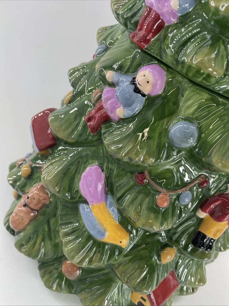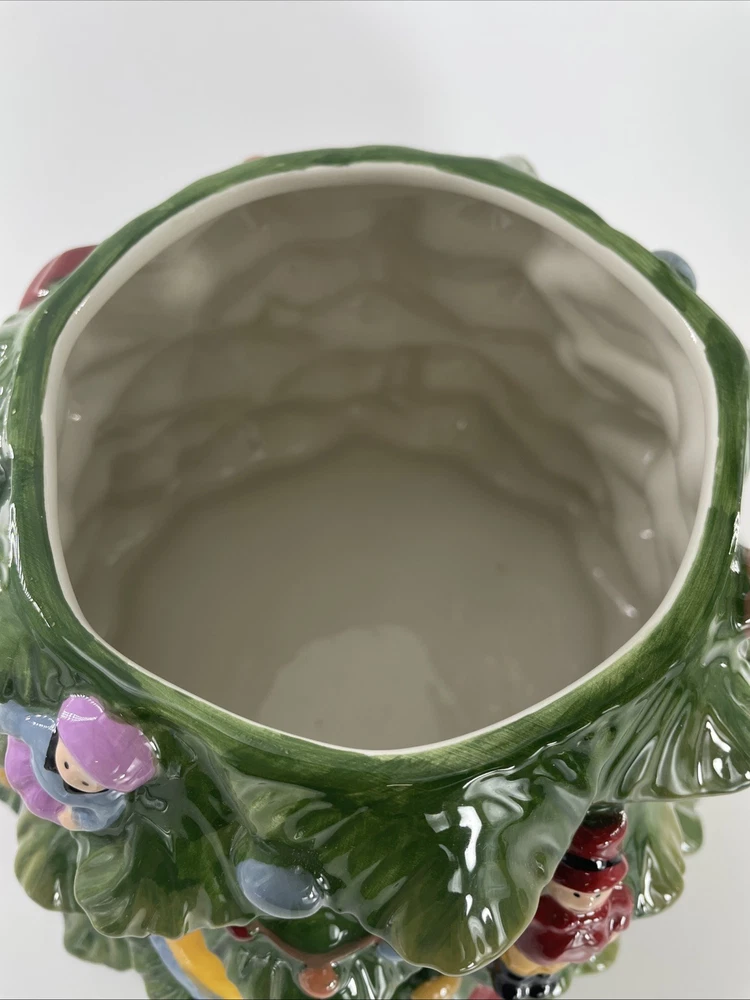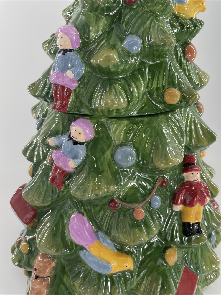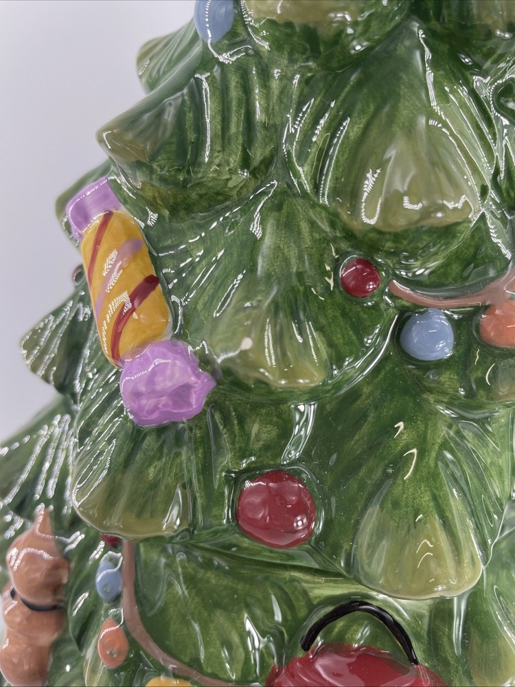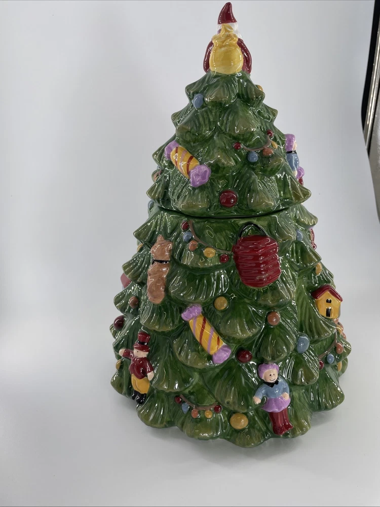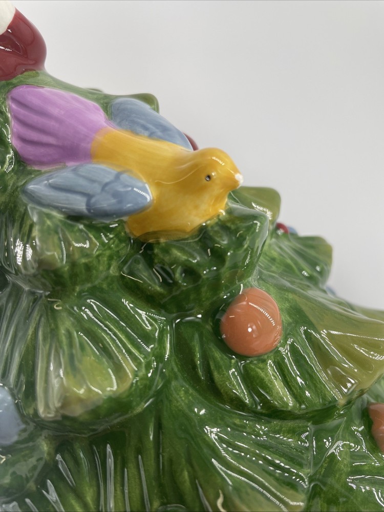 The Spode Christmas Cookie Jar is a handmade ceramic collectible featuring a multicolor Christmas design, perfect for storing seasonal treats. Manufactured in 1938, this vintage piece from the brand Spode adds a charming touch to any holiday decor collection. With its unique and festive design, this cookie jar is a timeless classic that will bring joy to your Christmas celebrations for years to come. I would like to disclose a couple of very tiny chips on the bird and I have put pictures in if you would like to take a look at the picture. They are so small they’re hard to find. Other than that, the cookie jar is in good condition.