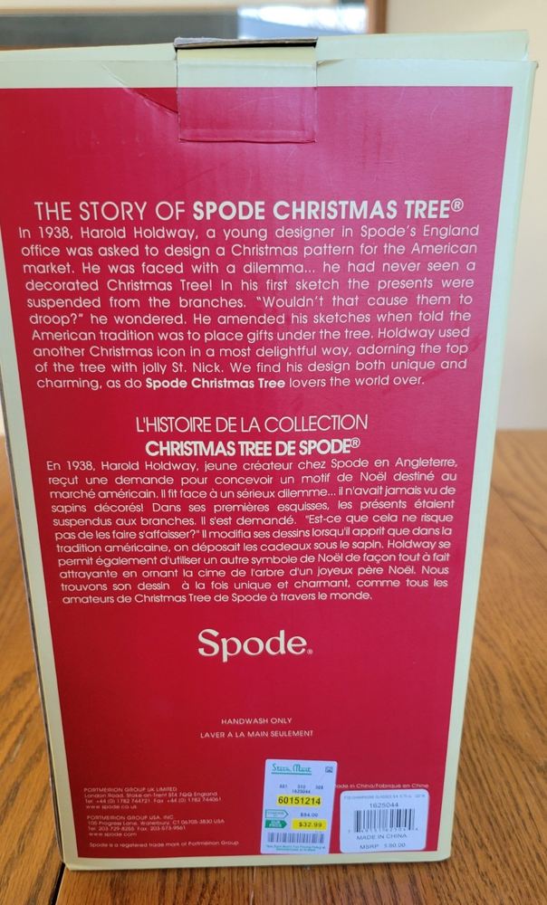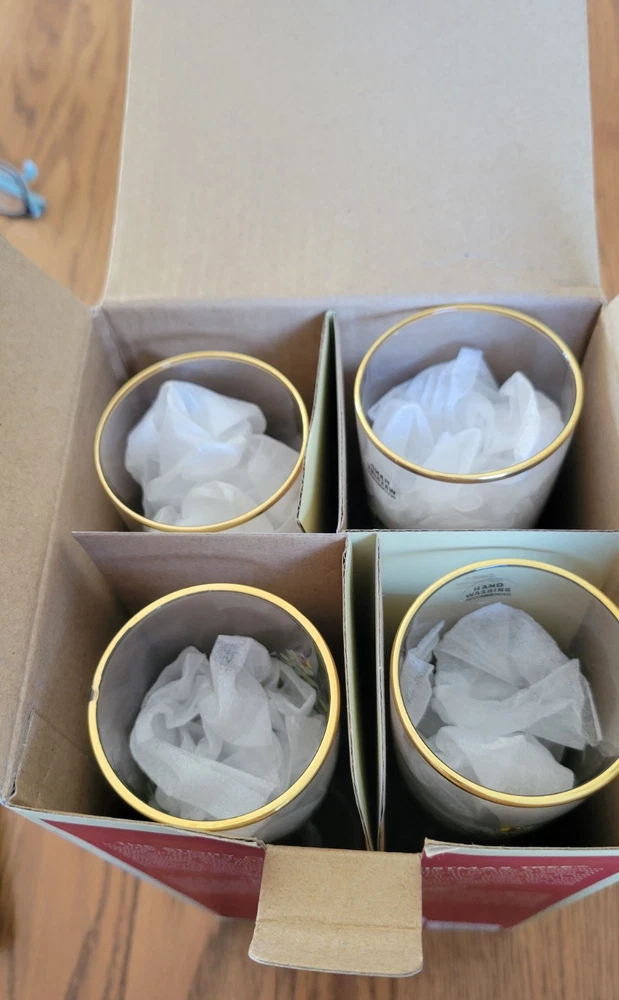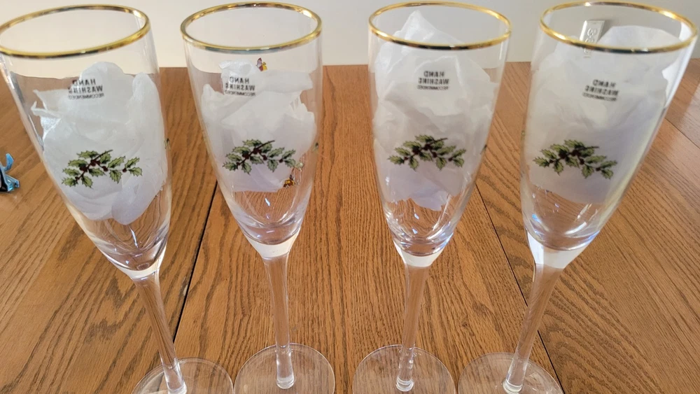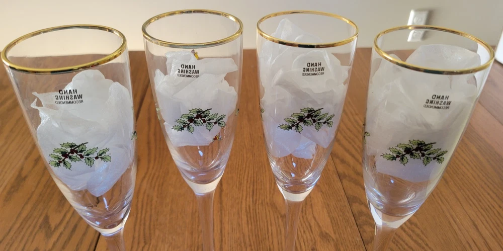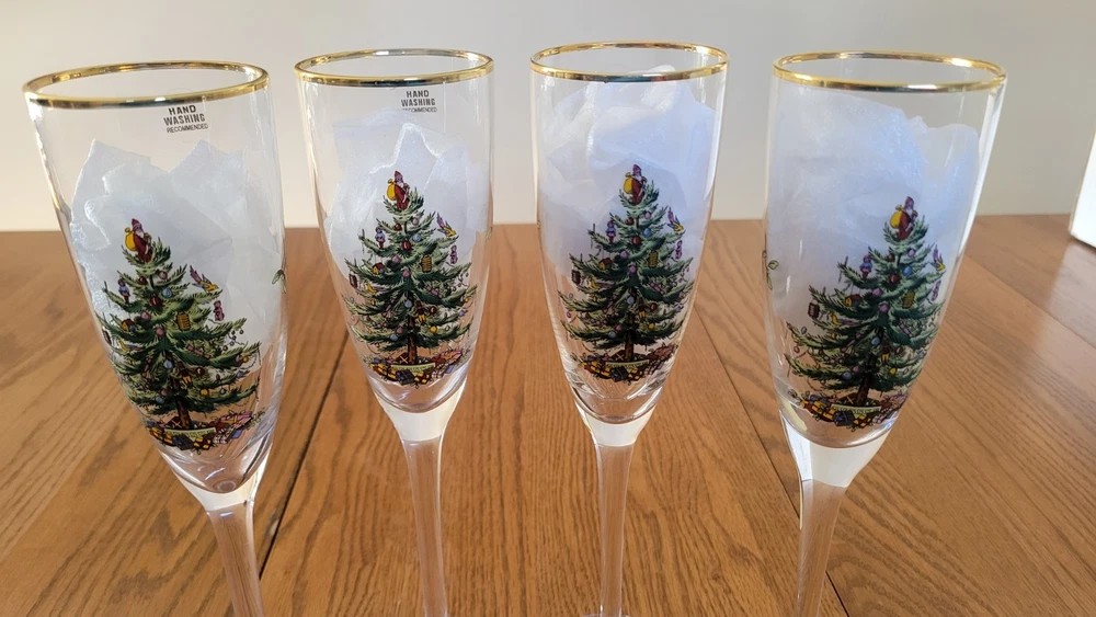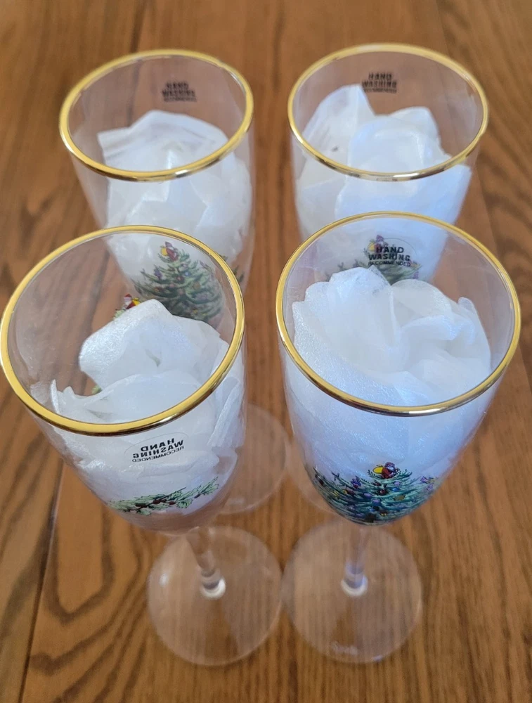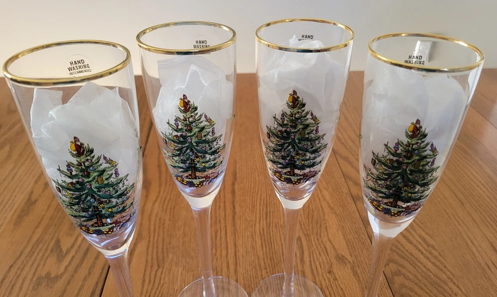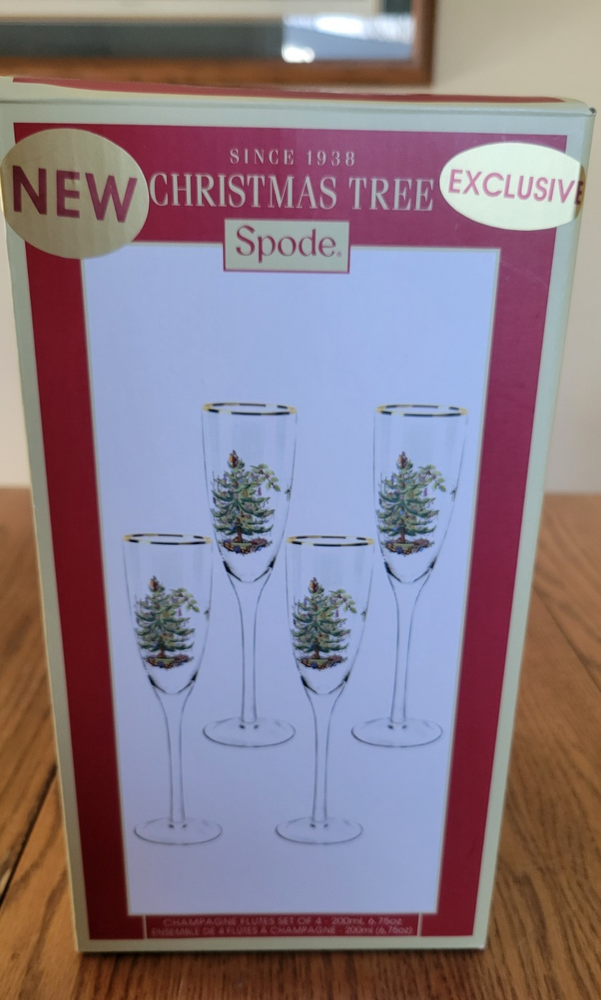 This is a beautiful set of four Spode Christmas Tree champagne flutes or wine glasses, each adorned with the iconic Spode Christmas Tree design and a luxurious gold rim. These elegant glasses are brand new and come in their original box, perfect for adding a touch of festive sophistication to your holiday celebrations or as a thoughtful gift. One glass seems to have a imperfection on one rim, see picture. Smooth rim, just a color imperfection. These still have the tags on them, have to assume new in box. Features: Brand: Spode Pattern: Christmas Tree Trim: Gold Rimmed Type: Champagne Flutes / Wine Glasses Quantity: Set of 4 Condition: New In Box (NIB) Classic Spode Christmas Tree design. Elegant gold rim detail. Perfect for holiday entertaining or gifting. Condition: New In Box (NIB), unused. Original packaging is included. Box may show minor shelf wear consistent with storage. Please see photos for details of the glasses and packaging. Spode, Christmas Tree, Champagne Flutes, Wine Glasses, Set of 4, Gold Rim, New In Box, NIB, Holiday, Christmas Decor, Drinkware, Festive Shipping: We take great care in packaging fragile items to ensure safe delivery. I describe as best as I can in my listings and be as thorough in my descriptions as possible. PLEASE LET ME KNOW IF YOU HAVE ANY QUESTIONS OR WOULD LIKE MORE PICTURES. THANK YOU!! THANKS FOR LOOKING! Please click on the link below to view my other listings – many cookbooks; magazines; vintage kitchen; household; glass and miscellaneous items. Thanks much!! Buy with confidence. I have been selling on ebay for over 15 years!! PAYMENT Immediate payment is greatly appreciated! If there is a problem and need more time or will be out of town, just let me know. If bidding on more than one auction, just send me a quick email to let me know and I will make sure to send you a combined invoice at the end of the auctions to reflect the largest discount available. Also, please note that we only ship to addresses that are CONFIRMED with Paypal. This is a Paypal rule -- not my rule. Sellers are not protected unless your address is confirmed. I will not ship to an address that is unconfirmed. Sorry for any inconvenience. SHIPPING All books can be shipped media mail, priority mail or parcel post. Media Mail is slower, that is why it costs less. It seems to average 7-10 days but I have seen it take longer. If you are in a hurry, please request priority mail. I will gladly combine shipping when possible, please e-mail me for combined shipping quote. I do my best to ship within 24 hours of cleared payment or when the post office is next open. Delivery confirmation is always included on domestic shipping and you can track your package using the link from paypal when you are notified that shipping label has been printed. ABOUT US Some of my items come from Estate Sales or Garage Sales. All items listed are sold "as is". Please ask any questions you may have before bidding. I generally answer all e-mails within 24 hours. We enjoy hunting estate sales for a good find. I keep a few for myself and sell some. Unfortunately, I do not know how books were cared for, where they were kept, if the people had pets or smoked. I check them for condition, and I check for any obvious smells and I try and describe them as good as I can – but this method is not perfect. Please keep this in mind when you bid on any used item – from me or anyone else. Unless the listing says that the item has always been located in their own home, then it’s impossible to know how that item was kept. Contact the seller in advance if you have any sensitivity to these or other odors before you buy to get as much information as you can.