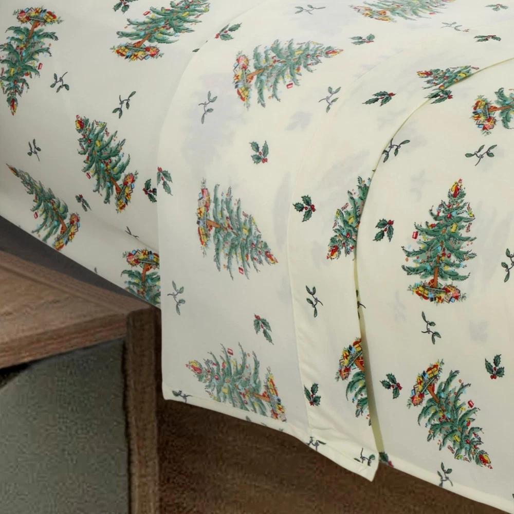 The Spode Christmas Tree 4-Piece Queen Sheet Set features the iconic Christmas Tree with ornaments and presents tossed in repeat surrounded by holly leaves and berries on a cream ground. Printed on 100% polyester. Set includes flat, 15" deep fitted sheets and 2 pillow cases. INCLUDES: (1) Flat sheet, (1) Fitted sheet, (2) Pillowcases MATERIALS & CARE: 100% Polyester. Machine wash cold, tumble dry low. DEEP POCKET: Fits mattresses up to 15". DETAIL: Features the iconic Christmas Tree with ornaments and presents tossed in repeat surrounded by holly leaves and berries on a cream ground. COLLECTION: Coordinate with the Spode Christmas Tree Collection including matching towels, tableclothes and more!