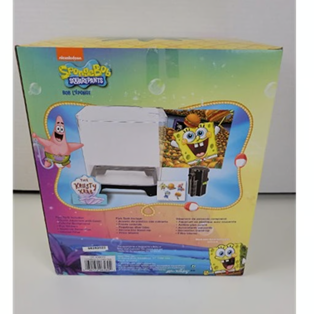 Sponge Bob Fish Tank 1.5 Gallons with Filter NEW SKU #N020 OFFICIALLY LICENSED: Penn-Plax helps you bring the marvelous wonder and joy of Bikini Bottom home with the SpongeBob SquarePants Aquarium Kit! This kit has most of the essentials needed to start a basic home aquarium for young beginners! The provided tank holds 1.5 gallons of water, and is made of strong and transparent plastic. EDUCATIONAL & FUN: This aquarium kit is perfect for teaching children the responsibilities of pet ownership, while keeping things simple and entertaining. The tank has enough capacity for a Betta, or even possibly some Shrimp, or very small schools of Guppies, Tetras, and other freshwater nano fish. SAFE, STRONG, AND DURABLE: The tank is made of clear, scratch-resistant plastic, which breaks in a safer manner than traditional glass aquariums. We know that accidents happen, and to help prevent any possible injury from a spread of shattered pieces, we chose plastic over glass. ITEMS INCLUDED: This kit includes the following: 1.5 Gallon Tank, Cascade 170 Fully Submersible Internal Aquarium Filter, Fully Colored SpongeBob Background and Stickers, along with a Corrugated Krusty Krab Sign (that sits above the tank’s cover). *Fish Not Included. MEASUREMENTS: This aquarium kit measures 8.5” (W) x 6” (D) x 9.5” (H), and is small enough to place into most spots, such as a desk or counter. Unlike other aquariums, you don’t have to worry whenever or not you have enough space! It will fit!